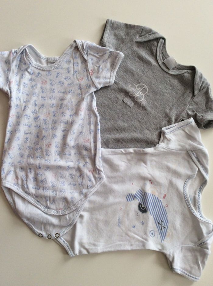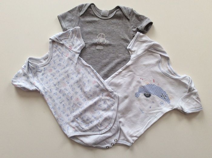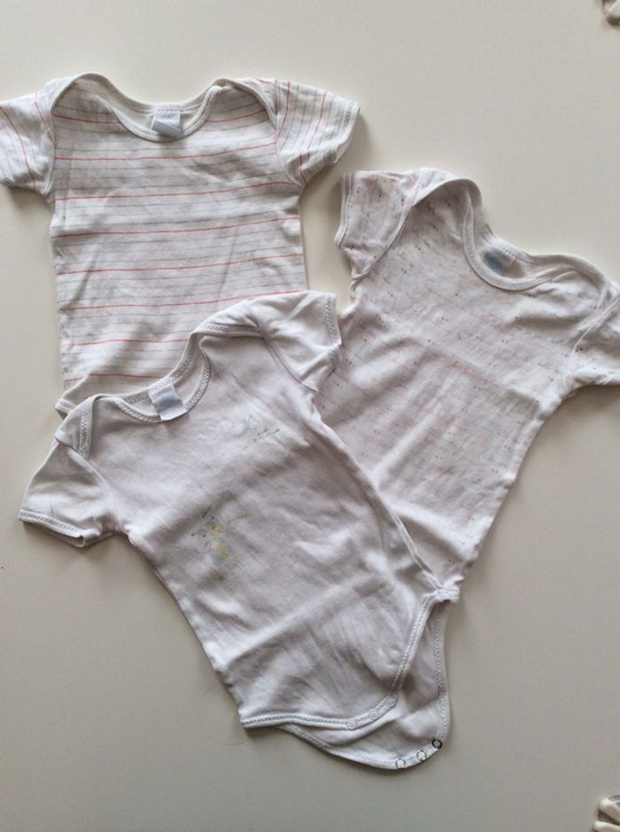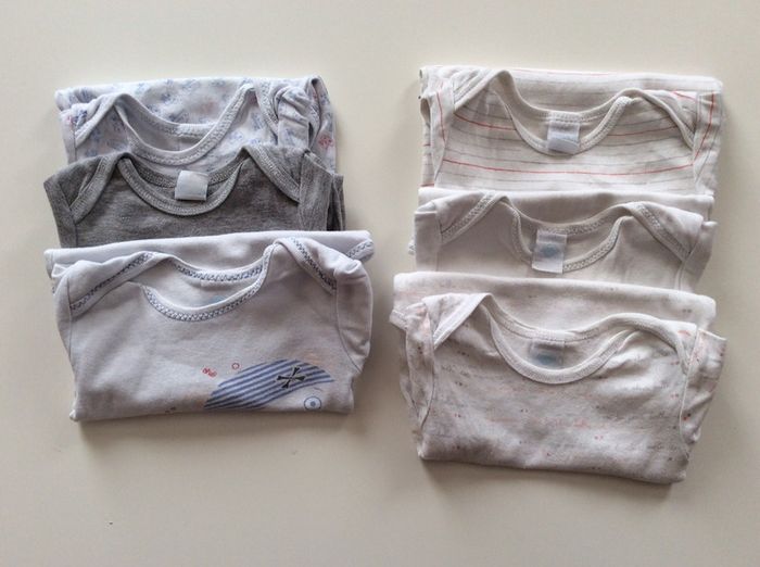 lot de 6 bodies mixte, pas mal porté, certains un peu bouloché, quelques défauts: tache, trou, fil tiré, peinture pression enlevé(voir photos 7,8,9), la couleur blanche est passé #dixhuitmoisgarcon_anais #dixhuitmoisfille_anais