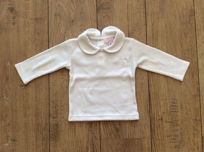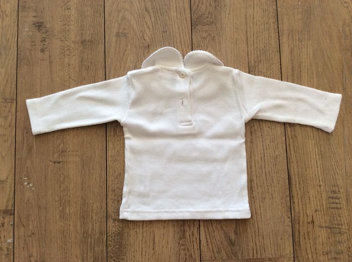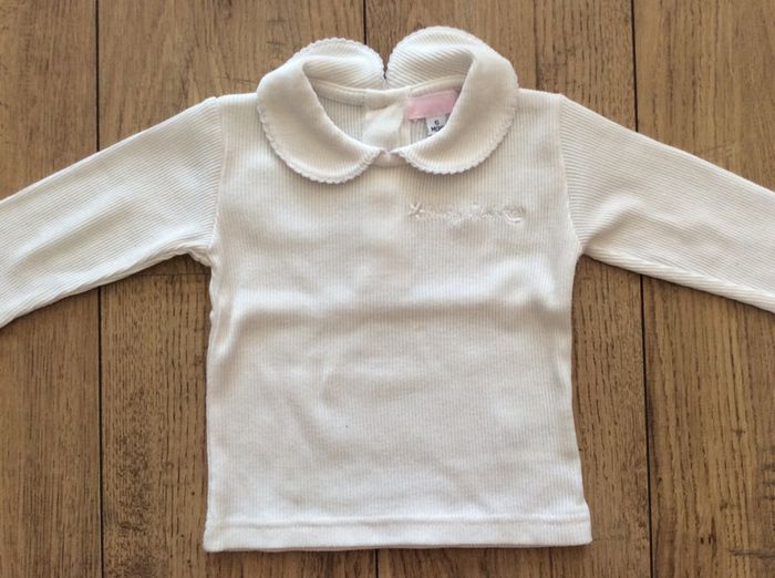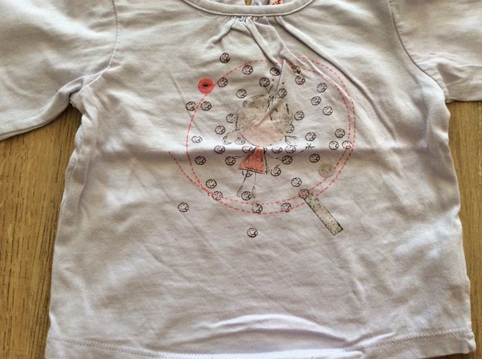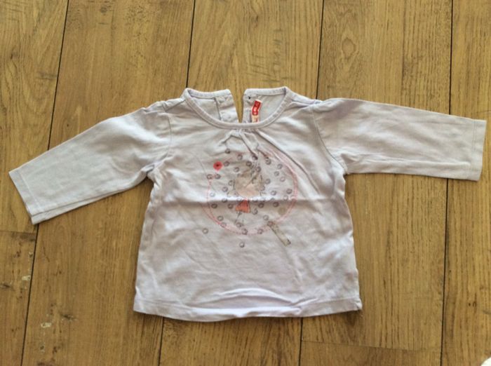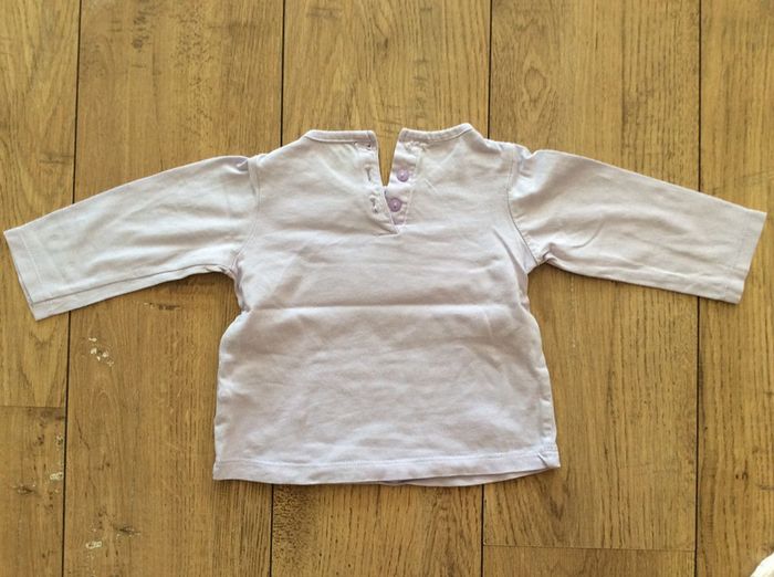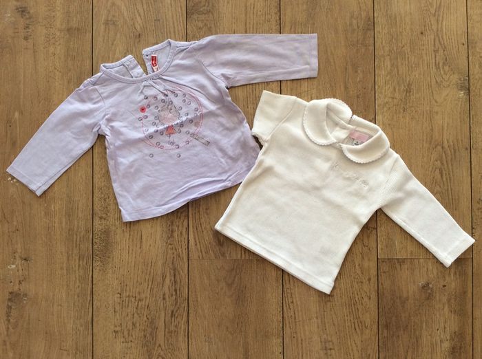 lot de 2 t shirts ML, le blanc (sans marque) en parfait état, le parme (dpam) a le dessin un peu usé et il manque un bouton (voir photo 3 et 4) je le donne donc avec l’autre #sixmoisfille_anais