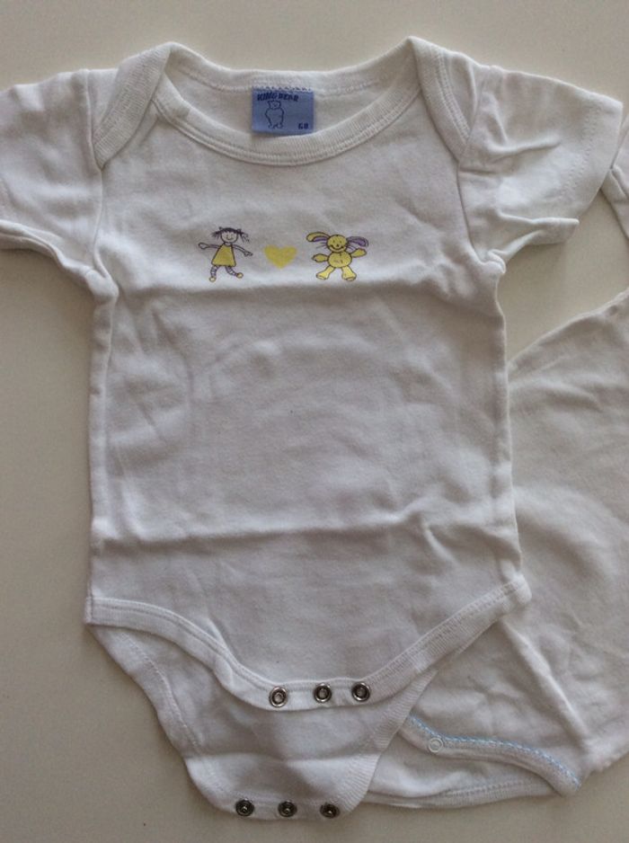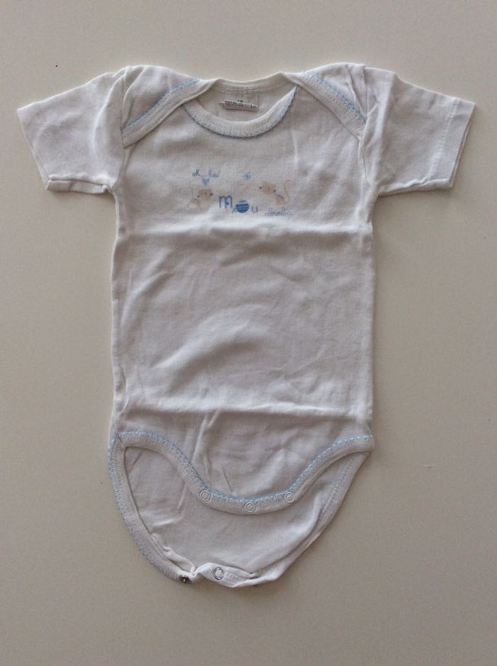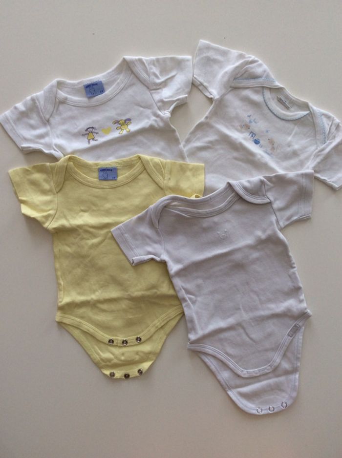 4 bodies, le blanc avec le dessin bleu en bon état, lot de 4 bodies, 6 mois qui peuvent encore servir: le jaune a une pression abîmé (voir photo 8), le blanc avec le dessin jaune est un peu jauni au col (voir photo 4) je donne le tout blanc qui a un peu déteint au lavage et qui est un peu gris et qui a un petit trou (voir photo 6 et 7) #sixmoisfille_anais #sixmoisgarcon_anais