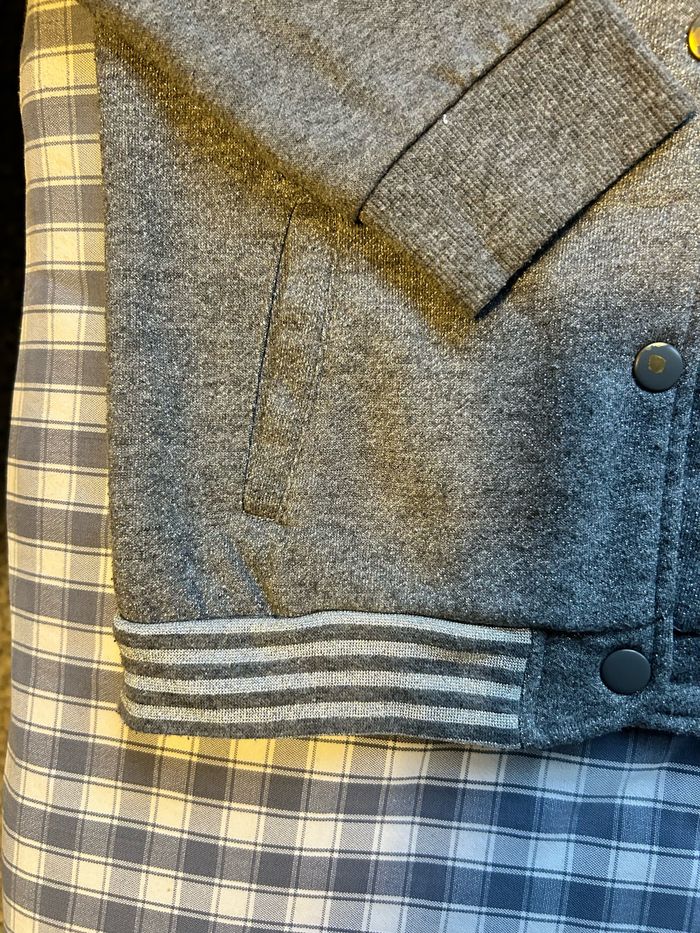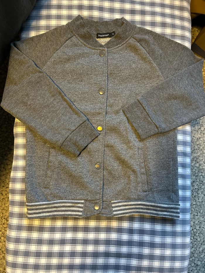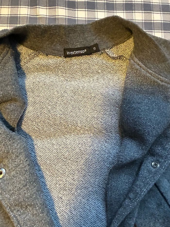 Gilet style veste Teddy en matière sweet. Taille 10 ans de la marque « Inextenso » Couleur gris anthracite et gris pailletée argenté. Se ferme par boutons de pression. Portée mais encore en très bon état.
