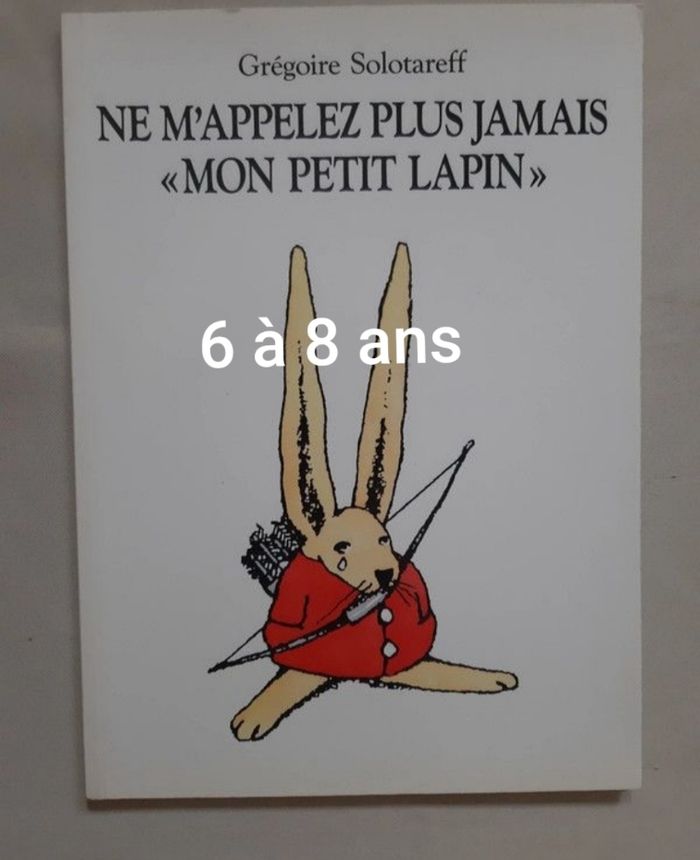 Album couverture souple. 6 à 8 ans Titre : Ne m'appelez plus jamais mon petit lapin Auteur : Grégoire Solotareff Éditeur : L'école des loisirs collection Kilimax Année : 1988 Il fait 29 cm de haut et 21 cm de large. 40 pages Voici l'histoire de Jean Carotte, un petit lapin qui en avait assez que tout le monde l'appelle « Mon petit lapin ». Alors, pour bien montrer aux grands qu'il n'est plus «leur petit lapin», Jean Carotte décide un jour de devenir le pire des lapins... En très bon état. 🏷 Remises automatiques pour l'achat de plusieurs articles. Tout n'est pas encore en ligne. N'hésitez pas à me demander. Vêtements de la taille naissance à la taille 3 ans disponibles. Jouets et livres disponibles.