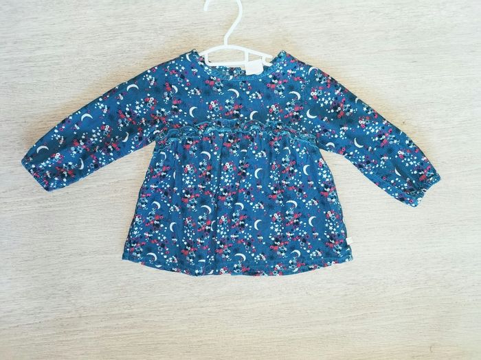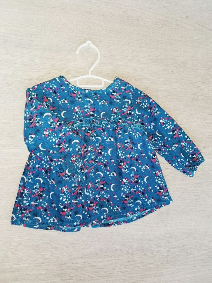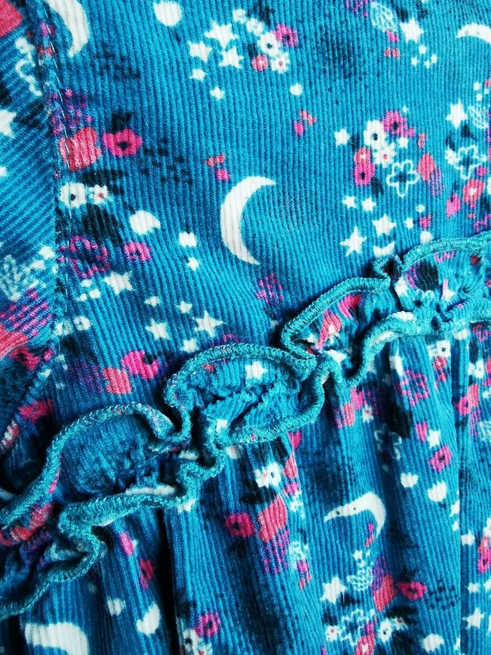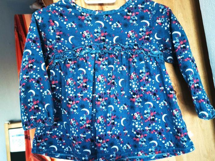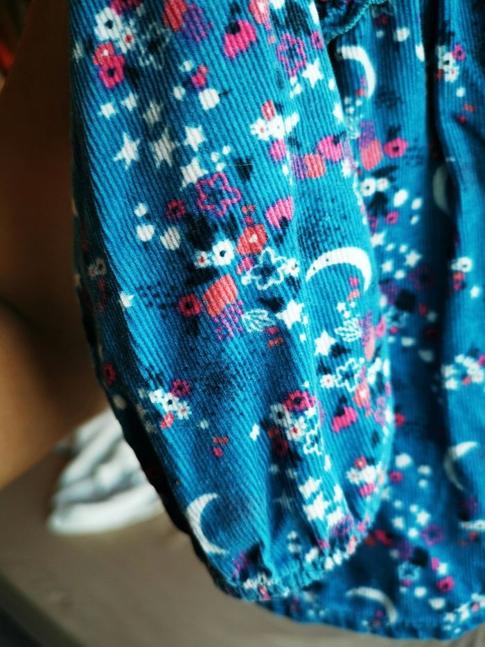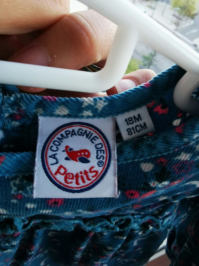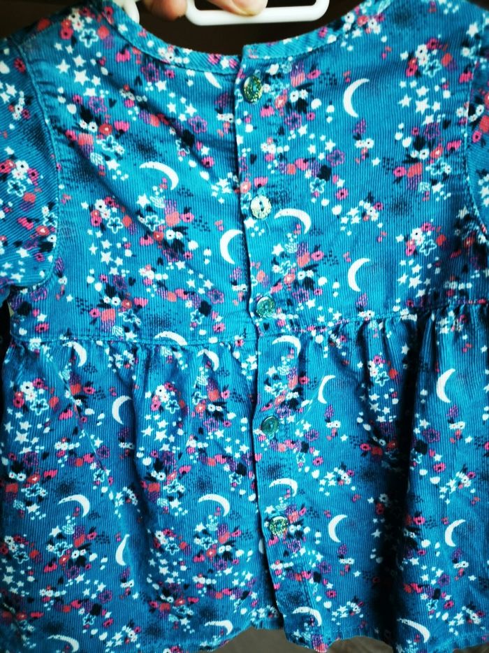 Vends blouse marque " la compagnie des petits" Couleur bleu canard, motif lune/étoiles blanches et fleurs roses fuschia. Matière 100% coton, vêtement effet velours, assez epais Taille 18 mois, 81 cm Portée 1 fois, comme neuve, boutons dans le dos + bouton de rechange sur l'étiquette