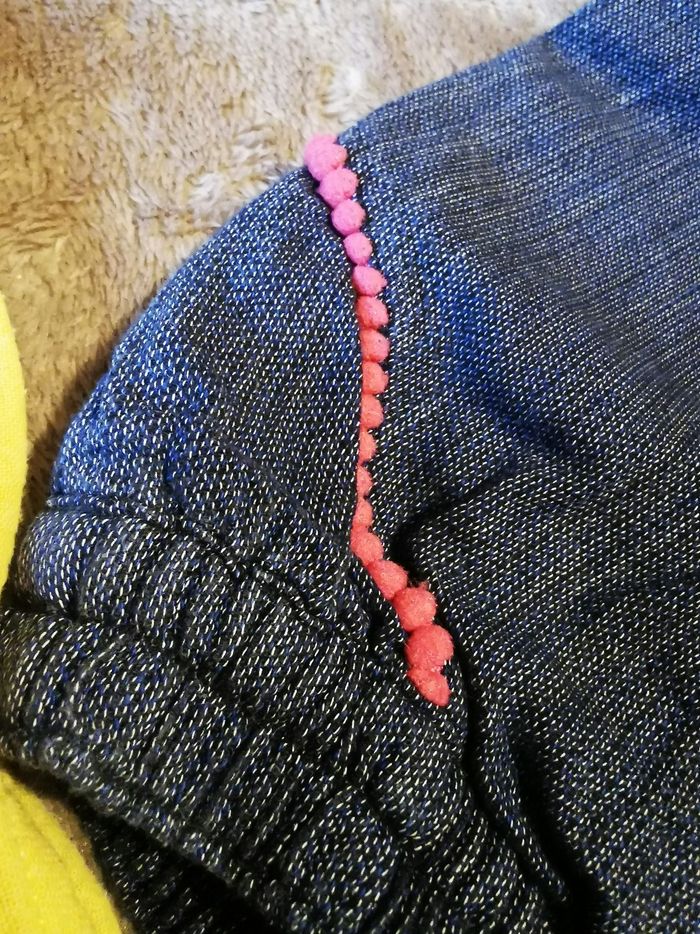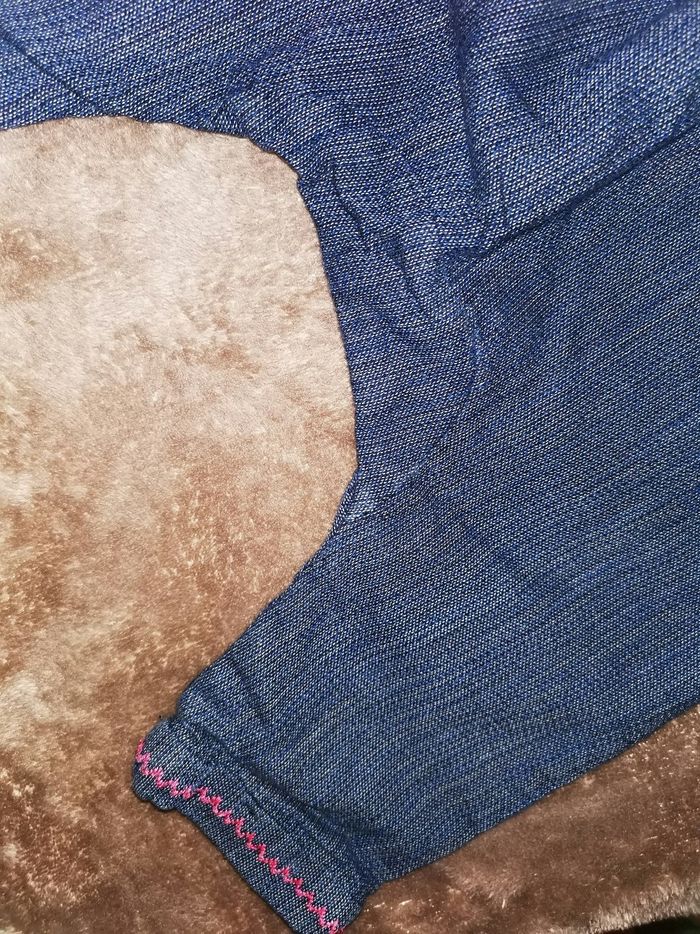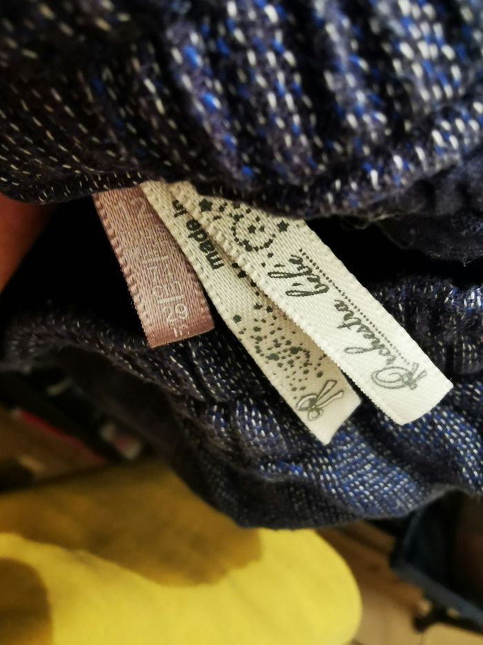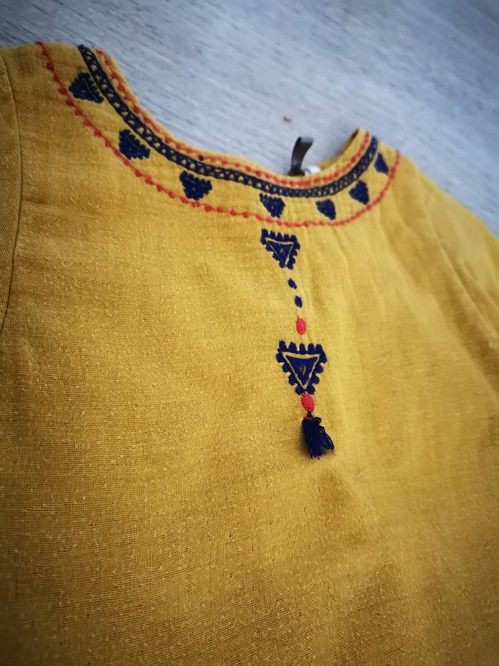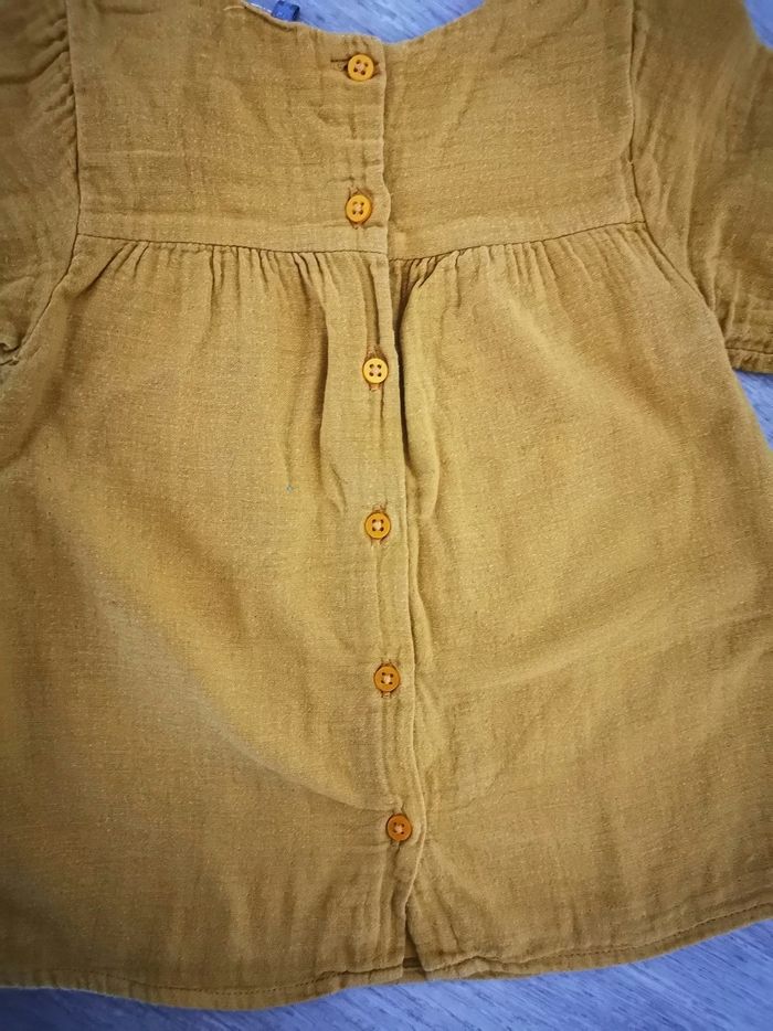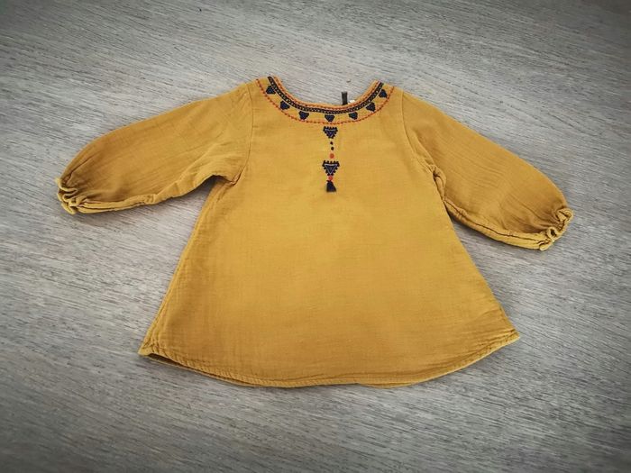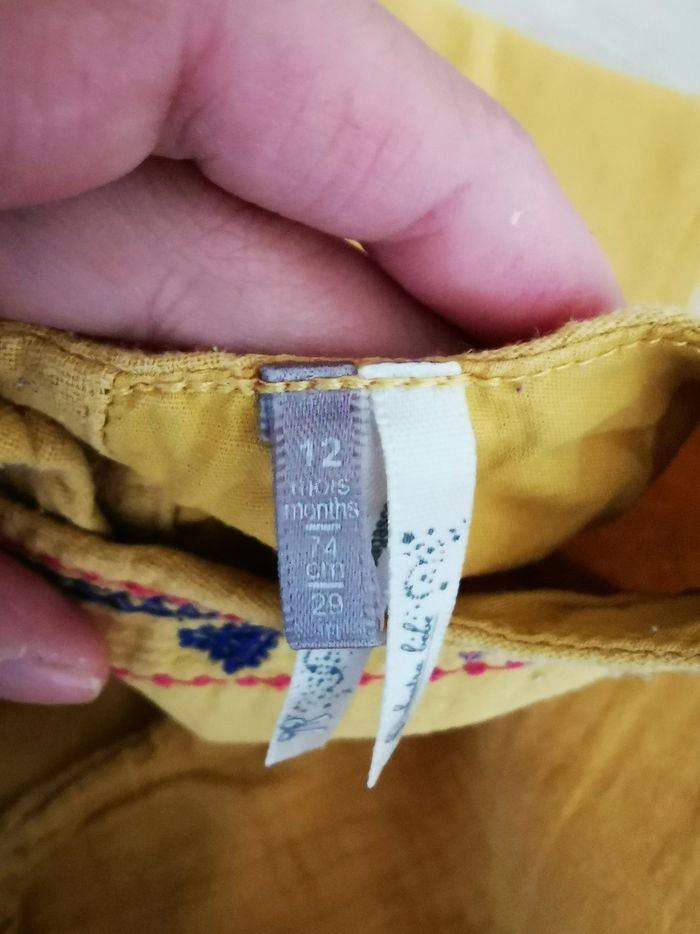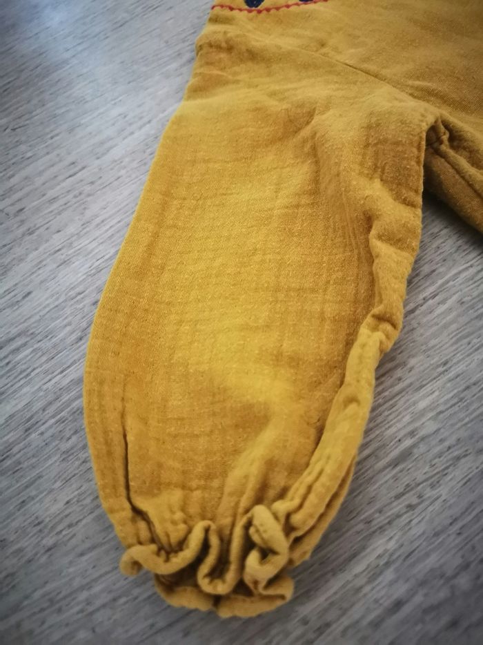 Ensemble blouse et sarouel Marque orchestra Taille 12 mois 74cm Blouse couleur jaune curry avec broderies. S'attache avec boutons dans le dos. Très bon état. Sarouel neuf, jamais portée, couture rose fuschia.