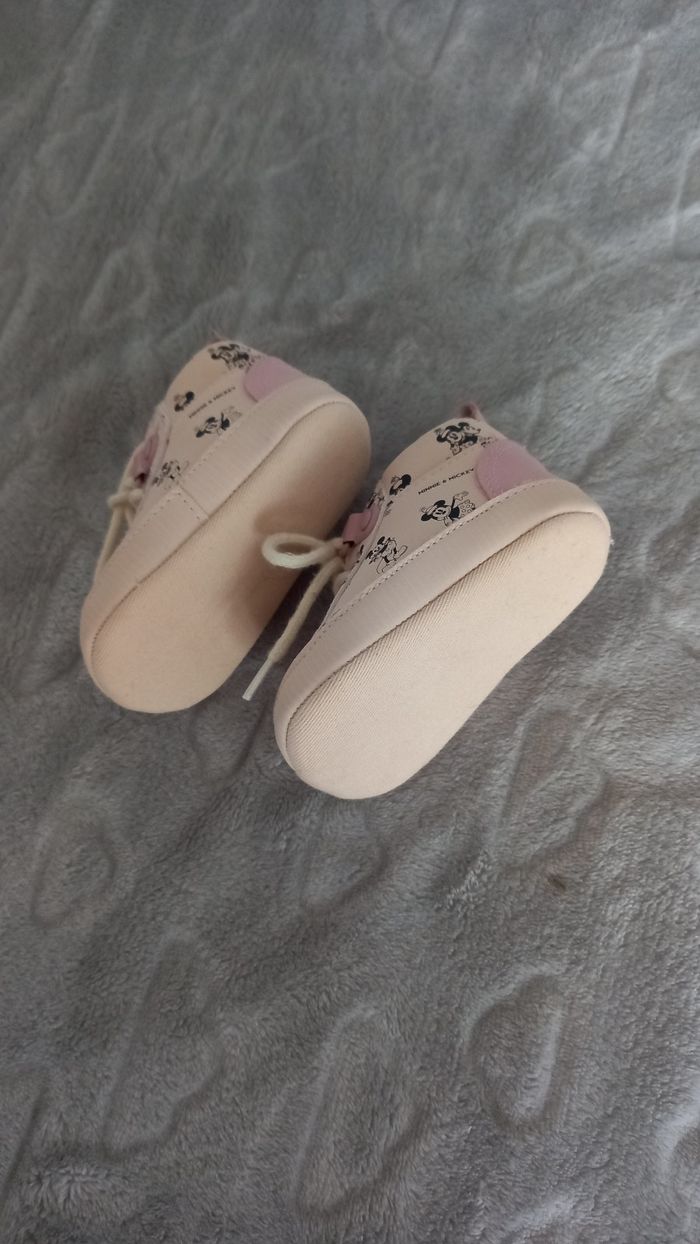 Petites chaussures souples Minnie&Mickey. Elles n'ont jamais été portées. Taille 3/6 mois. Elles sont légères, idéales pour la saison printanière. Couleur rose pâle saumon.
