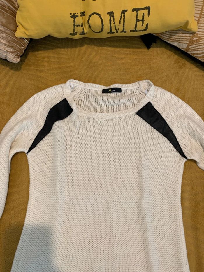 Pull mailles femme, manches longues, détails simili cuir, col rond « Mim » taille S Quelques peluches #pullfemme #pullmancheslongues #pullcoltond #pullmailles #pullfemmetailles #mim