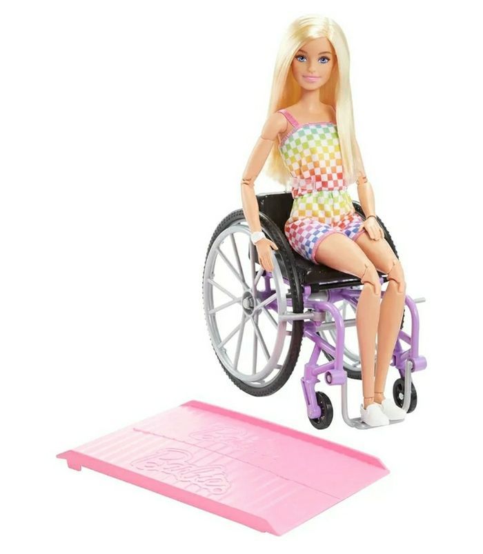 NEUF JAMAIS OUVERT BARBIE ET SON FAUTEUIL ROULANT avec rampe rose Age conseillé : dés 3 ans Dimensions : 21 x 30 cm Ce coffret contient donc une poupée Barbie arborant une longue chevelure blonde que les enfants pourront s'amuser à brosser et à coiffer. Barbie est toujours à la pointe de la mode, elle porte une tenue fashion composée d'un combi short à carreaux multicolores et une paire de baskets blanches. Elle porte également une montre à son poignet. Pour permettre à Barbie de se déplacer partout, elle est fournie avec son fauteuil roulant manuel violet et d'une rampe d'accès rose. Afin de permettre à Barbie d'adopter toutes les poses et postures, elle dispose de 22 points d'articulation. Composition : -Une poupée Barbie Fashionista avec 22 points d'articulation -Un fauteuil roulant manuel -Une rampe rose