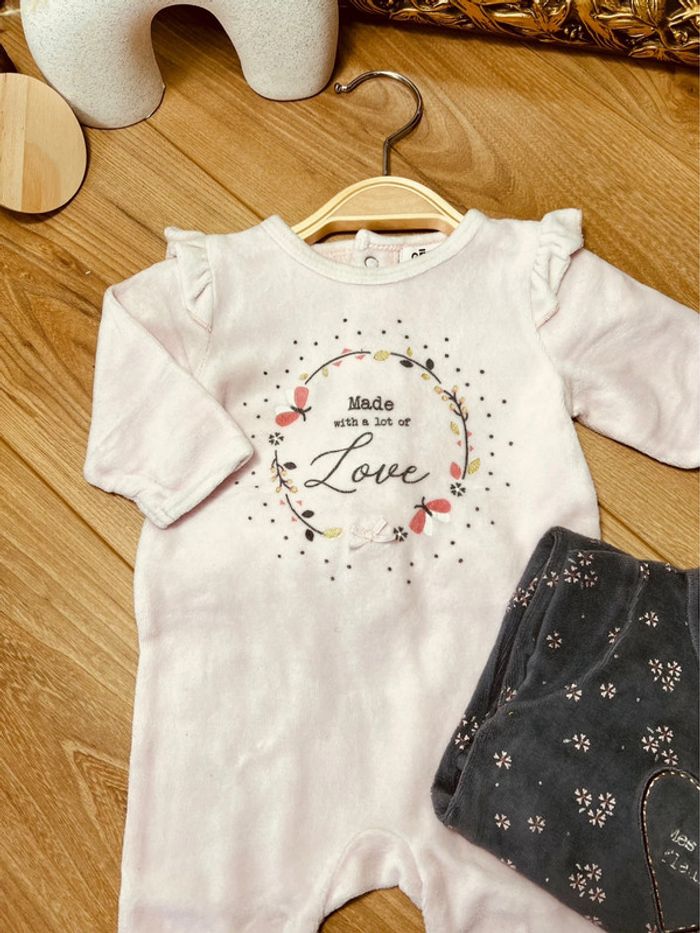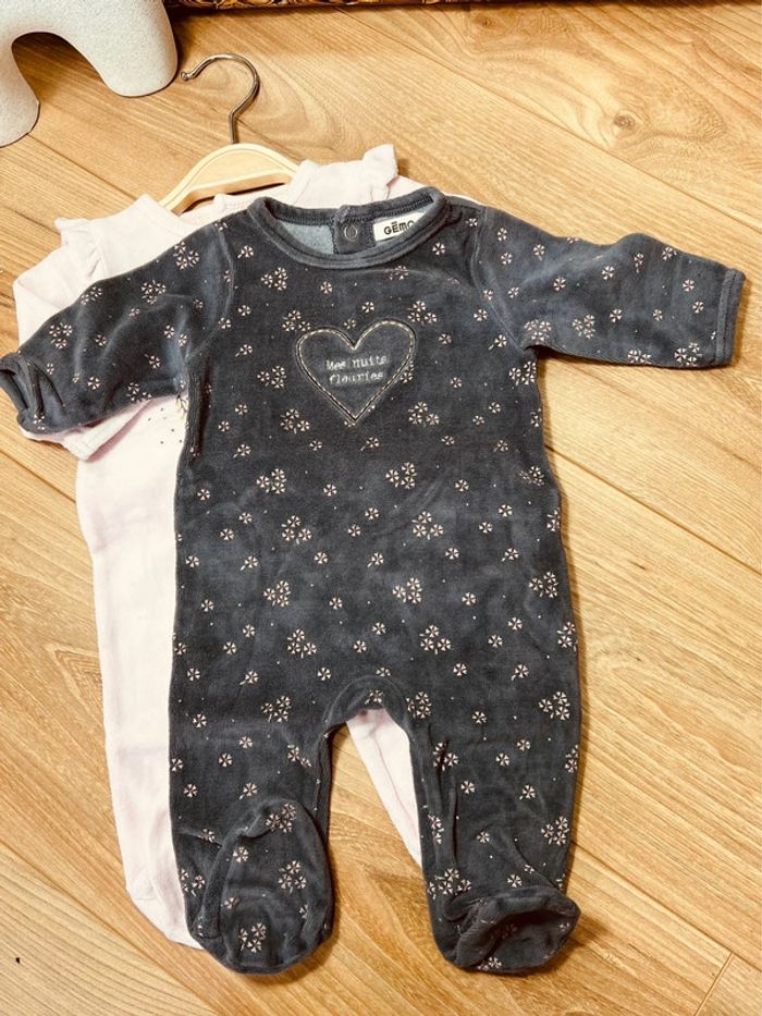Taille 3 mois lot de 2 pyjamas velours fille Gemo gris rose pale * fleurs * 🎀 - photo numéro 1