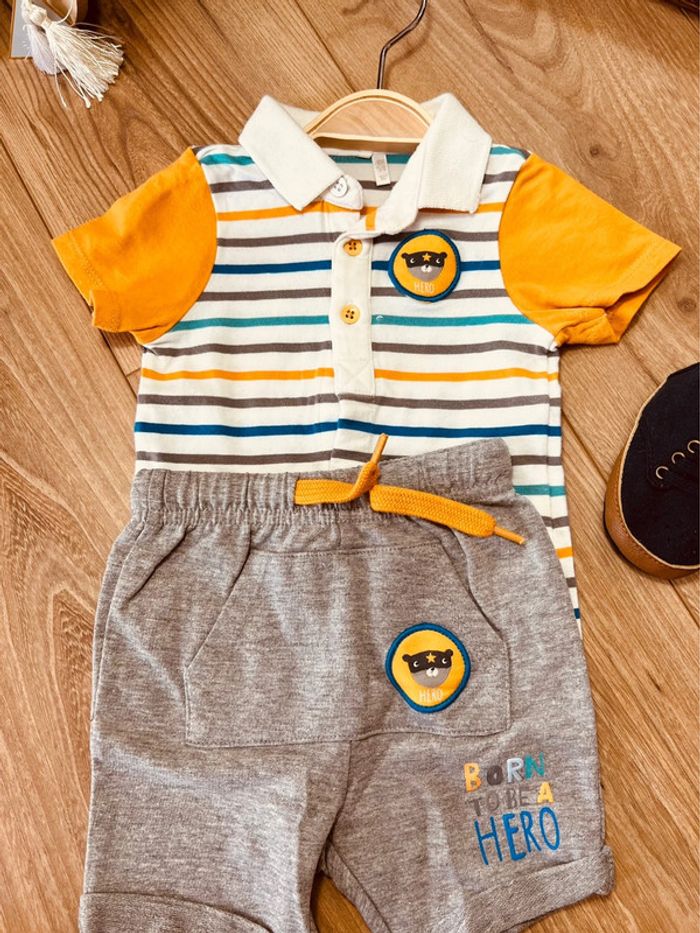 Taille 6 mois ensemble 2 pièces d’été garçon orchestra gris bleu moutarde * ours rayures * 💙 - photo numéro 1