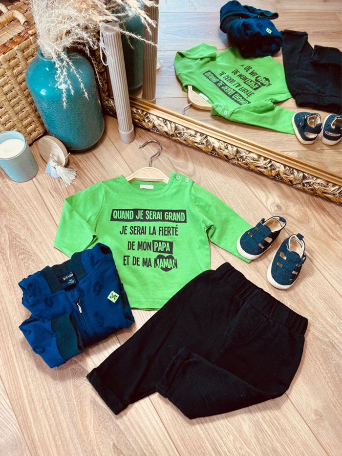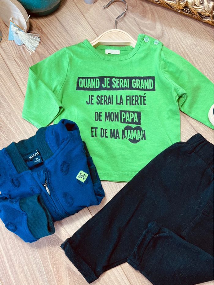 Taille 3 mois ensemble 3 pièces garçon Kiabi petits cailloux vert noir bleu marine * papa maman * 💙 - photo numéro 1