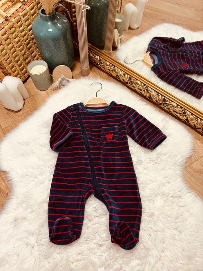 Taille 1 mois pyjama velours garçon TAO bleu marine et rouge * rayures * 💙 - photo numéro 1