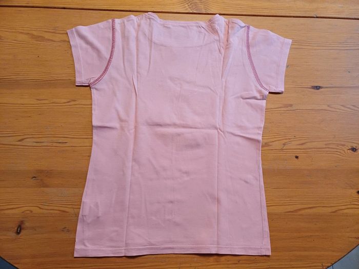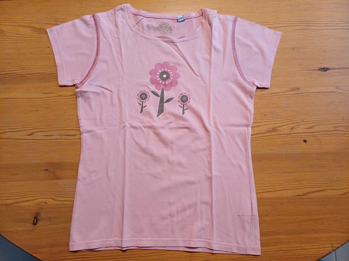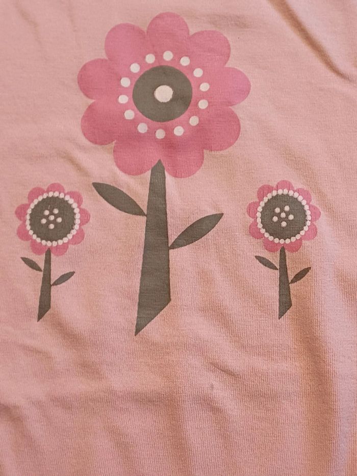 Tee-shirt Okaïdi en très bon état sauf une toute petite tache sous la grande fleur. Taille 12 ans / 150 cm.