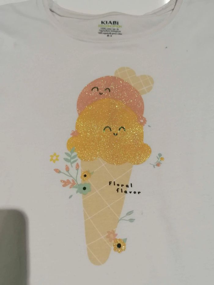 2 thee shirts fille Taille 8 ans Bien mis Celui avec les cœurs à les couleurs passer Celui avec la glace pailleté il y a une petite tâche Reste bien encore