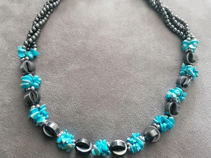 Jolie collier pierres Bleu turquoise et gris nacré Les pierres bleu son un peu blanche pas endroit légèrement.. Rien de grave