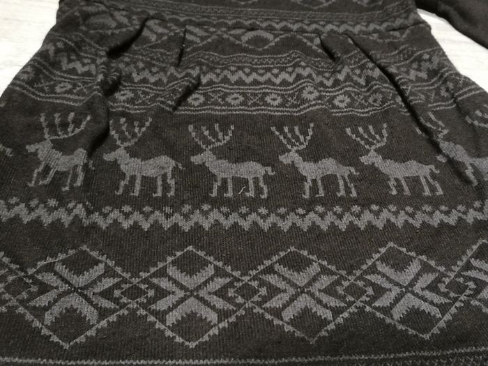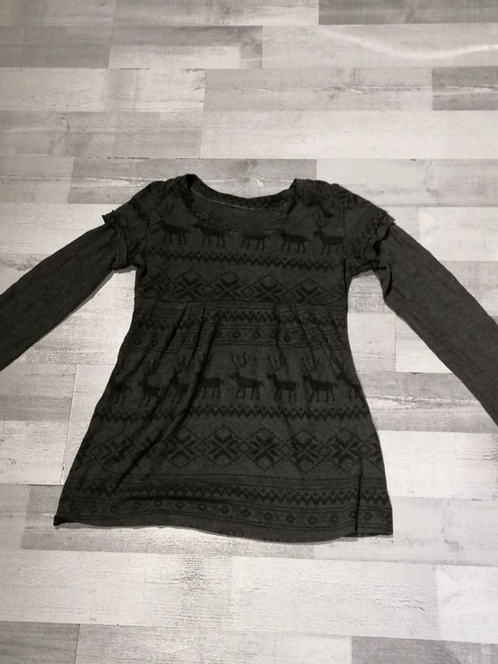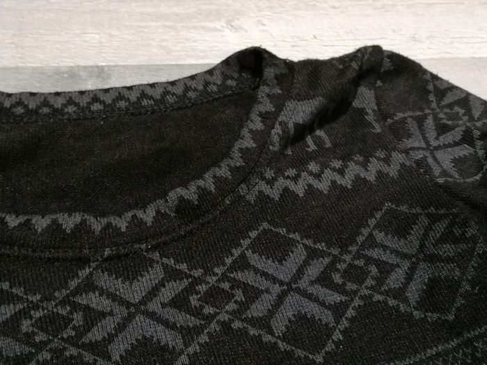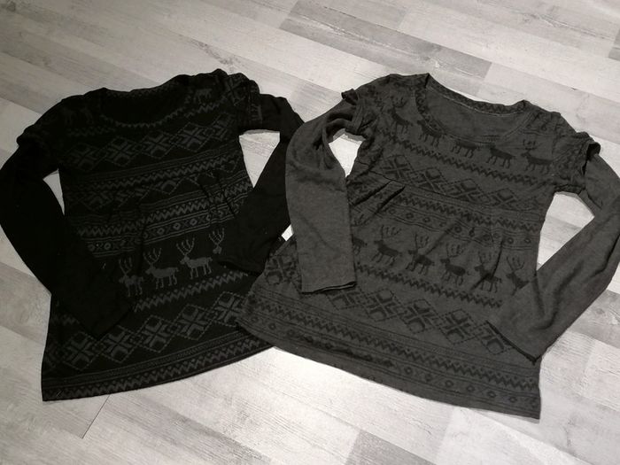 Lot de 2 pulls motif Noël Un noir avec un trou au dos, a racommoder Le gris est sans défaut Manches cousu Proche du corps TU mais 36 petit 38