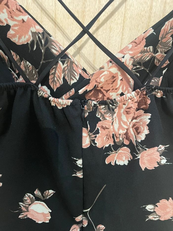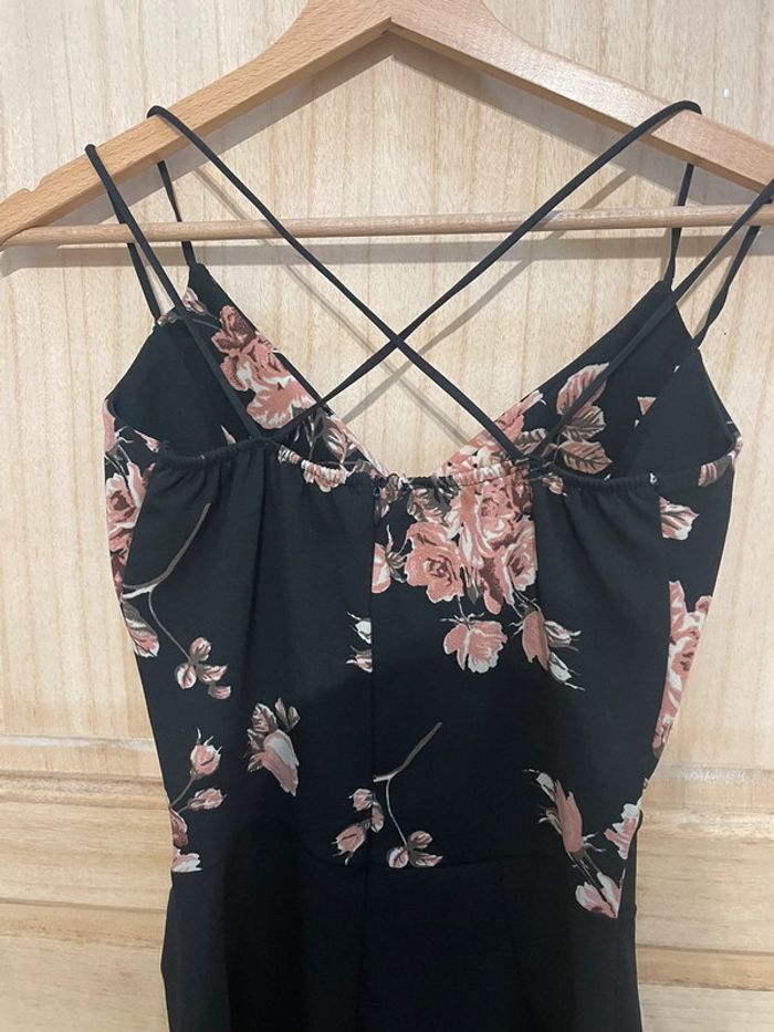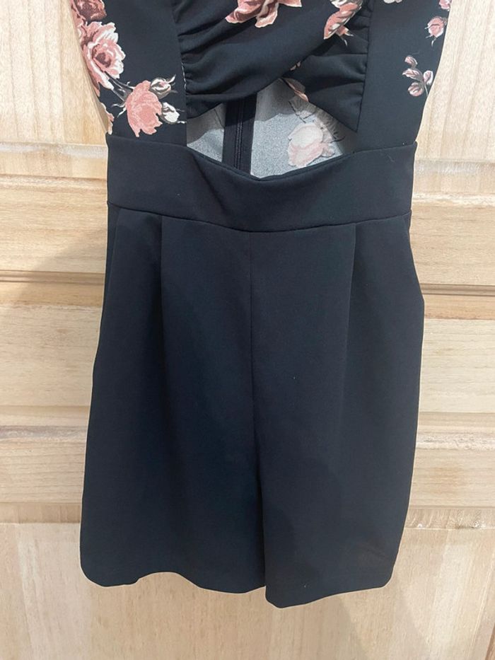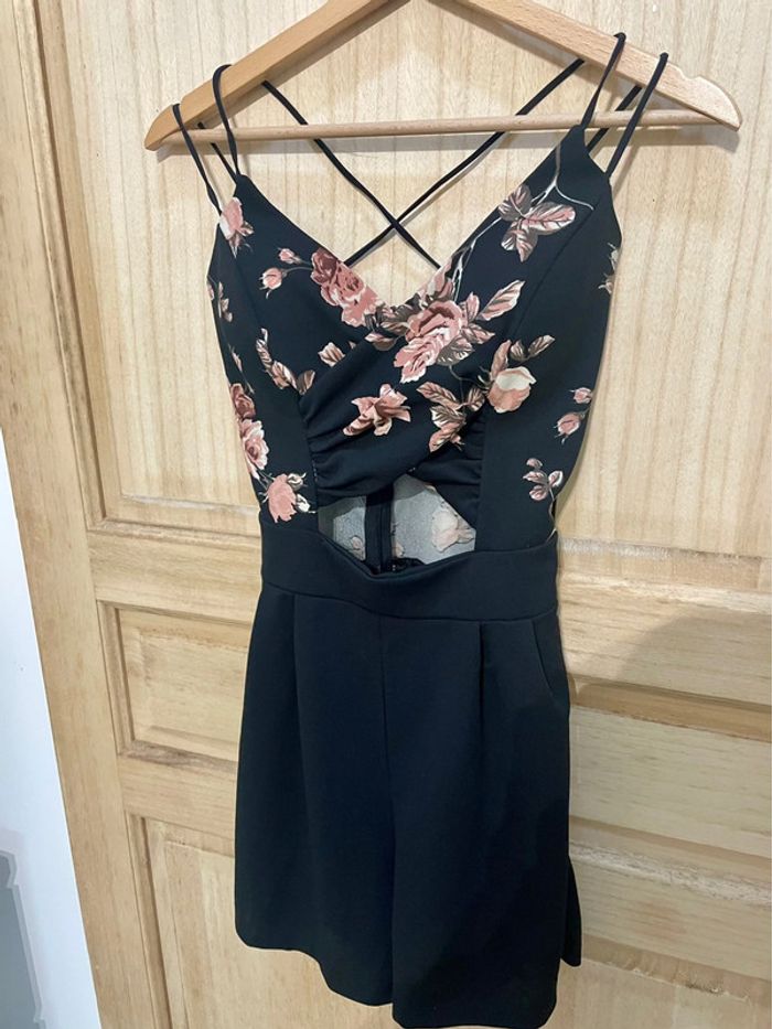 Combi-short tendance noir avec motifs fleuris Dos nu avec fines bretelles croisées, petit decolté et petite ouverture haut du ventre Très peu mise #jennyspearstailles