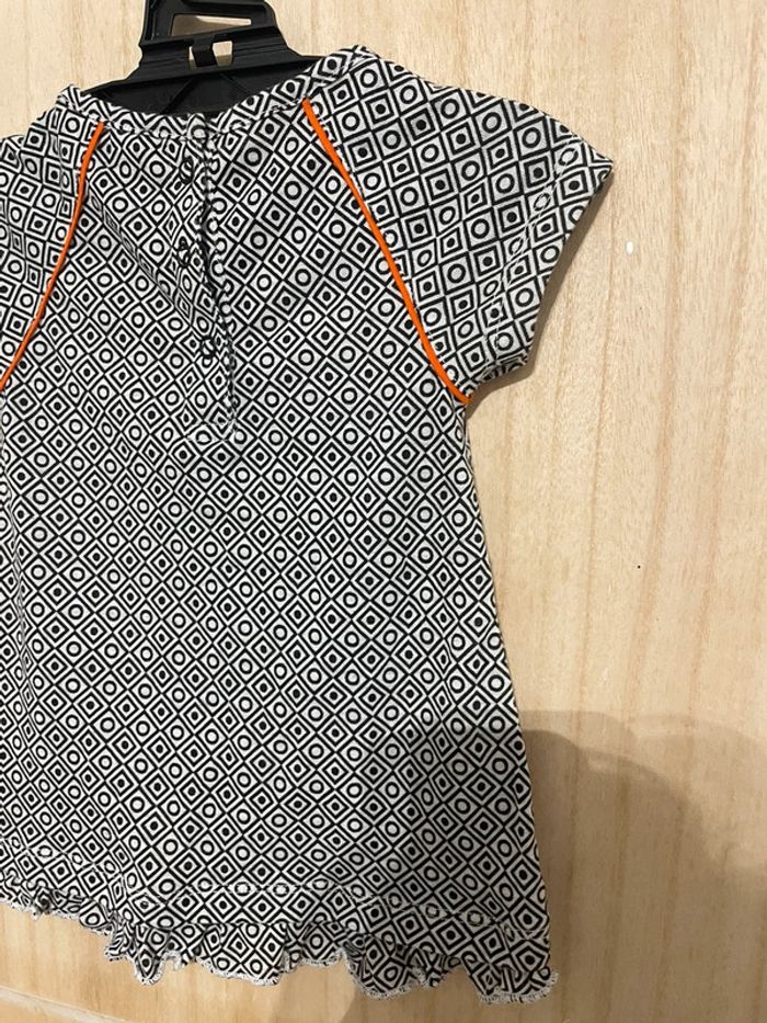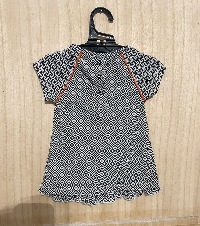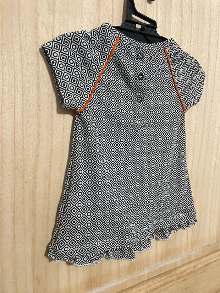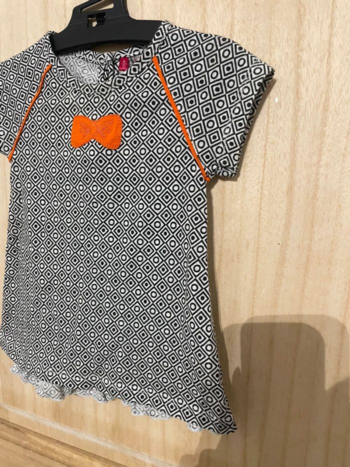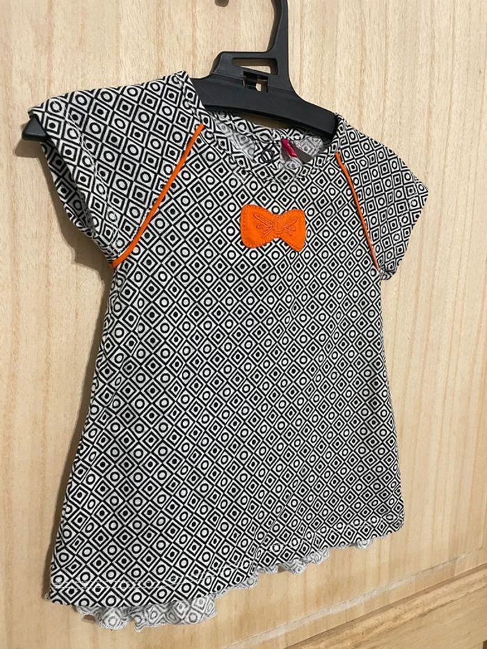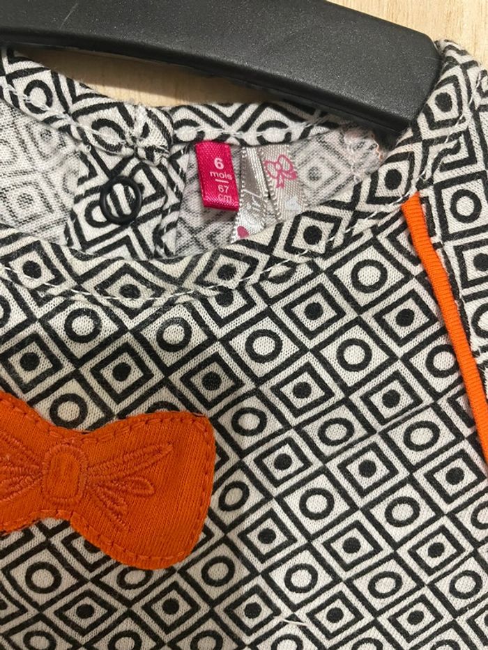 Robe manches courtes matière légère. Noire et blanche avec touche de orange Petit noeud et formes géométriques #jennyspearsbebefille6mois