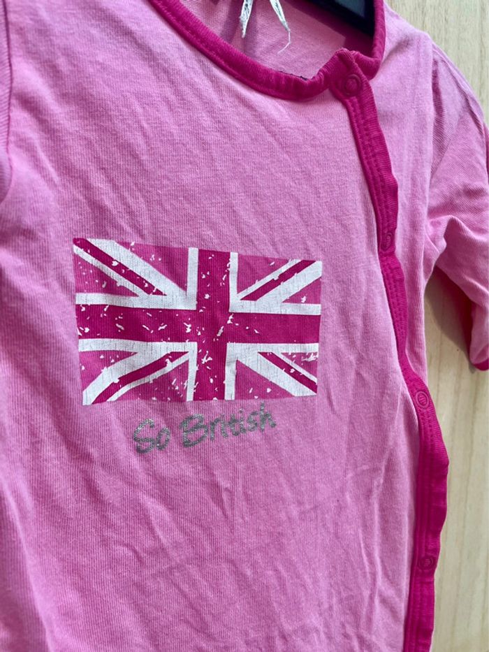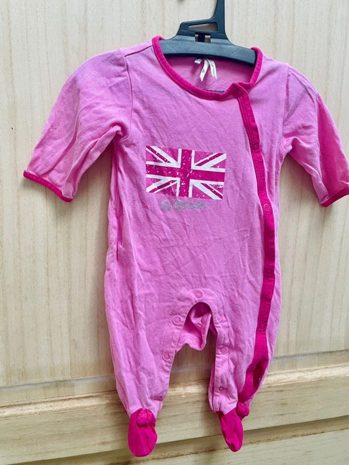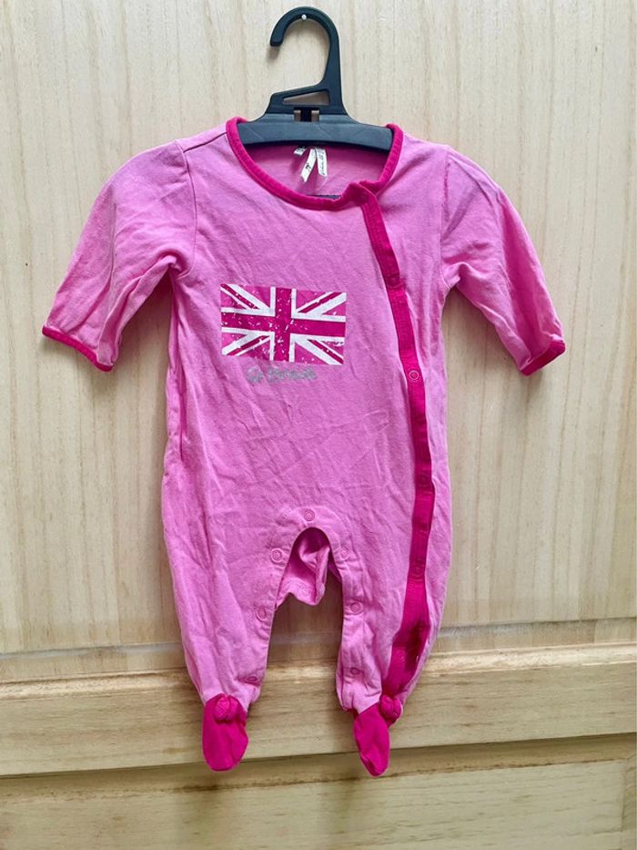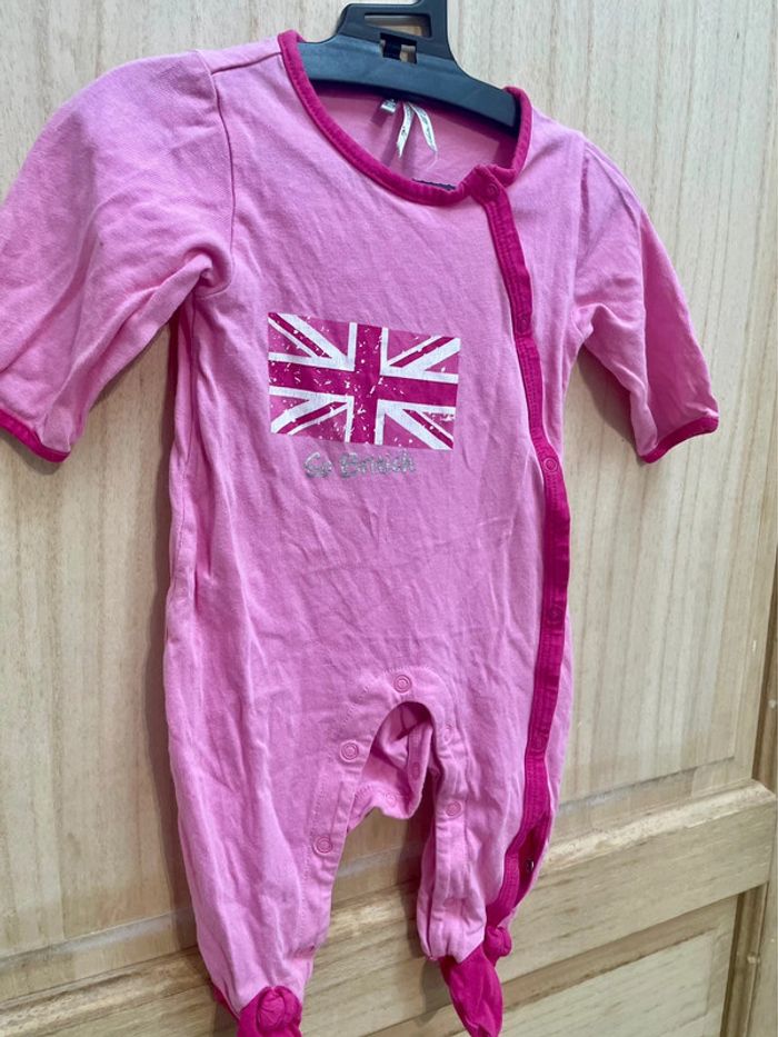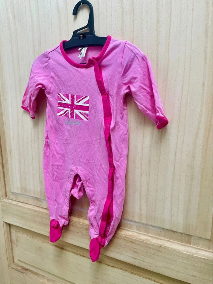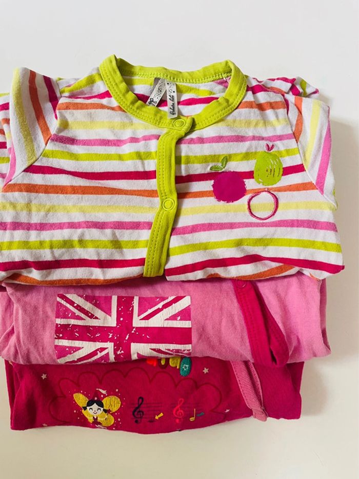 Lot de trois pyjamas rose une pièce, l’ouverture par l’avant 1 - du pareil au même (dpam) Dessin rébus avec fée, coccinelle et notes de musiques 2 - orchestra baby rose avec dessin drapeau royaume-unis Et l’autre à rayures #jennyspearsbebefille3mois