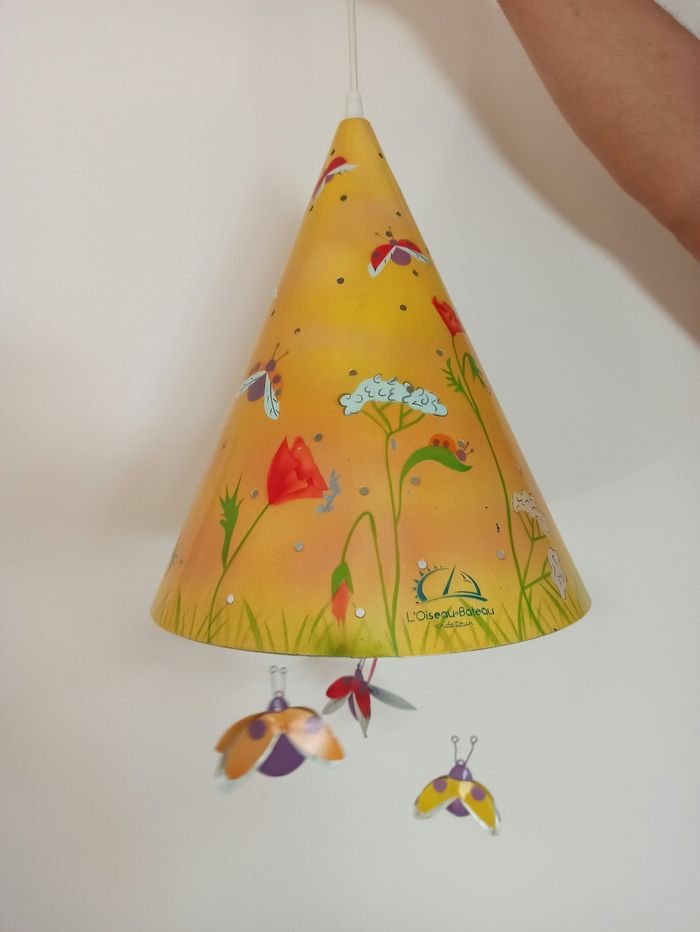 Très belle suspension pour chambre d'enfant achetée chez Bébé 9 - créateur L'oiseau et bateau. Fond jaune fleuri en métal. Très bon état. Dim : 28x35 cm