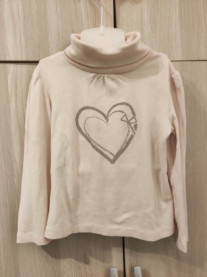 Pull col roulé Marque Vertbaudet 5 ans 108 cm Couleurs rose avec motif dessin coeur gris. Manches longues. Col montant qui se ferme au dos par bouton. 100 % coton. Parfait état. Comme neuf.