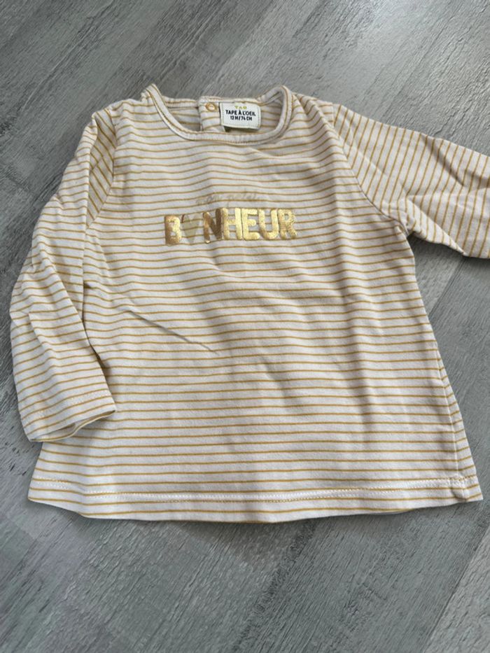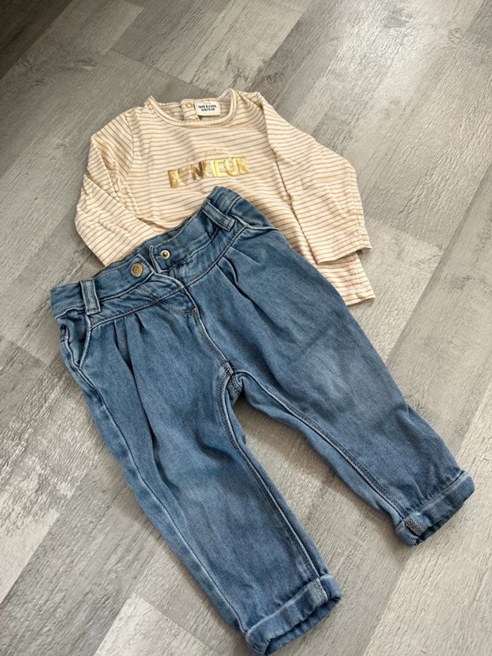 Ensemble jean et teeshirt manches longues. Jean carotte et teeshirt manches longues à pressions à l’arrière. TAO / 12 MOIS.