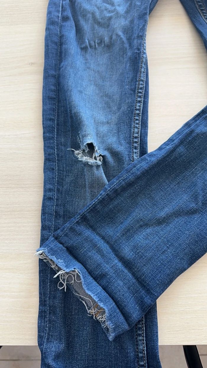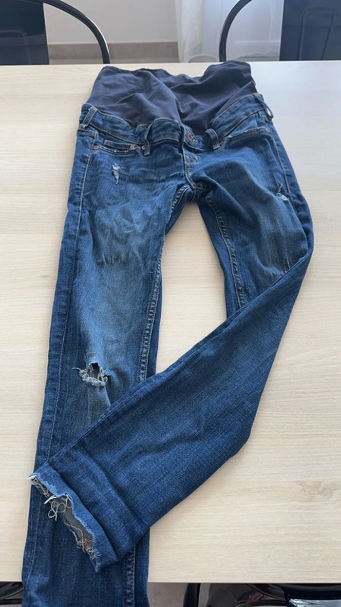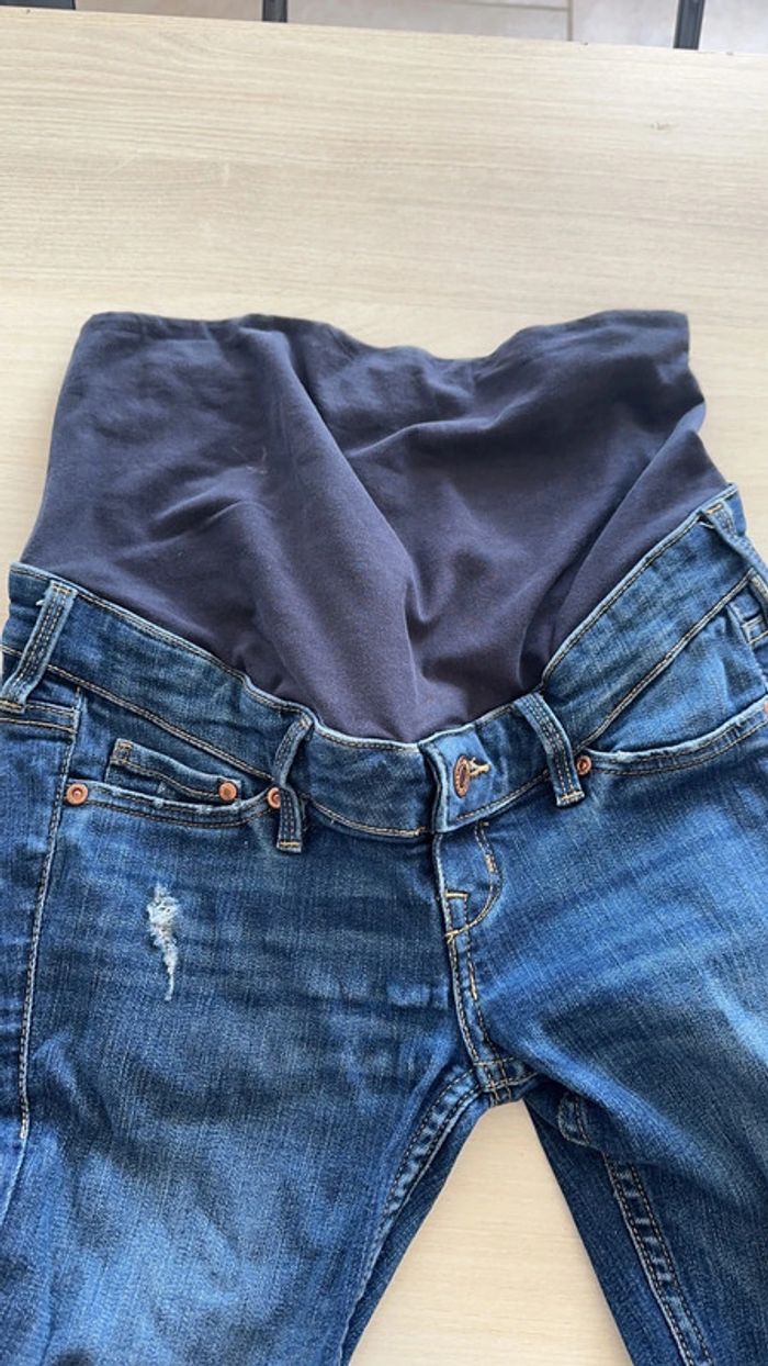 Jean de grossesse de la marque H&M. Style usé et troué. Elastique au niveau du ventre. Petite usure un niveau de l’élastique dans le dos (voir photo). TAILLE : 34.