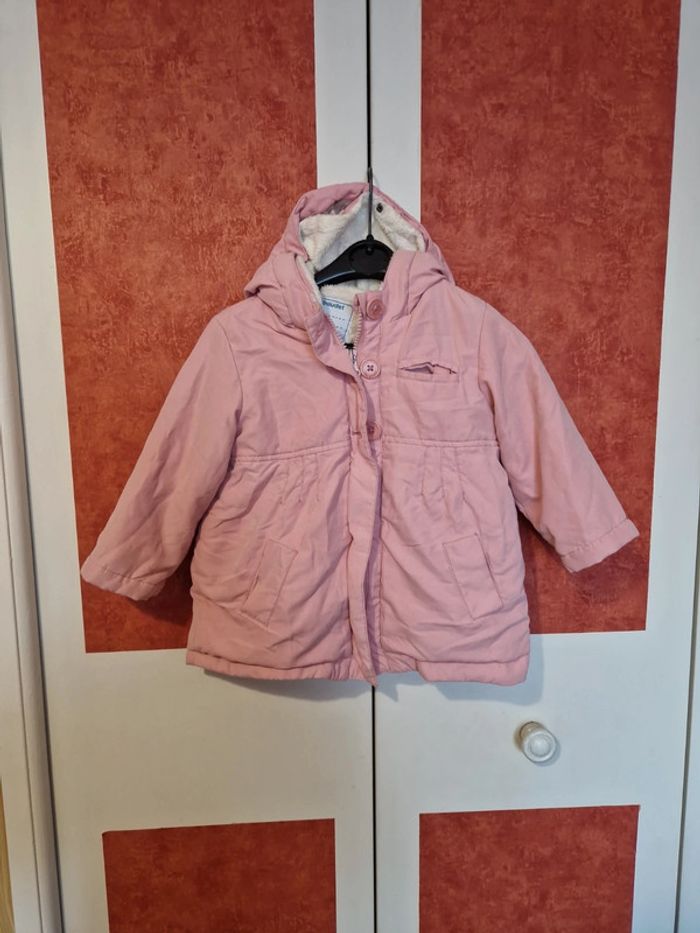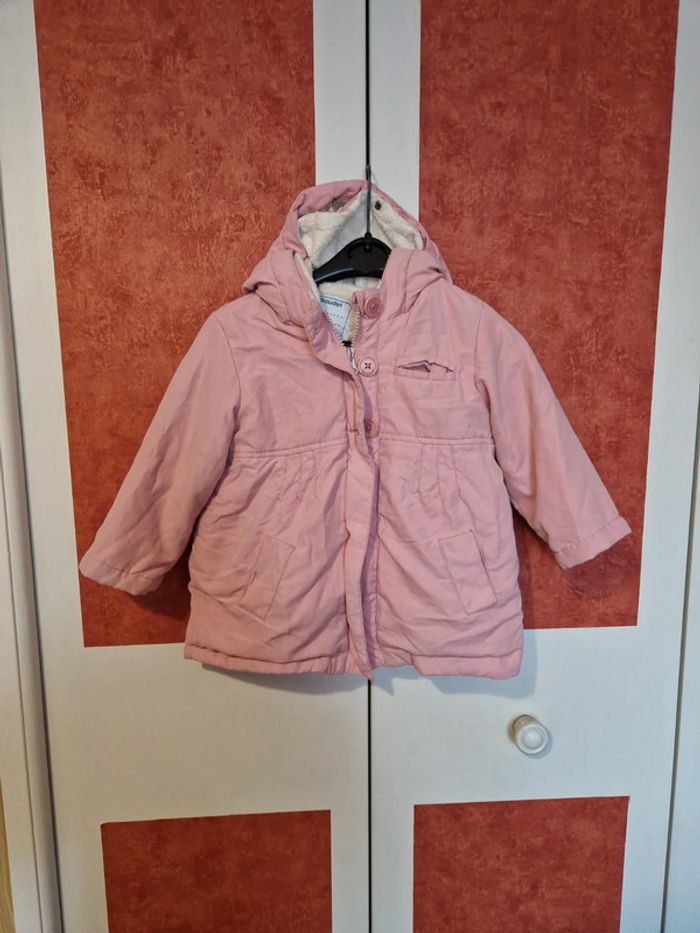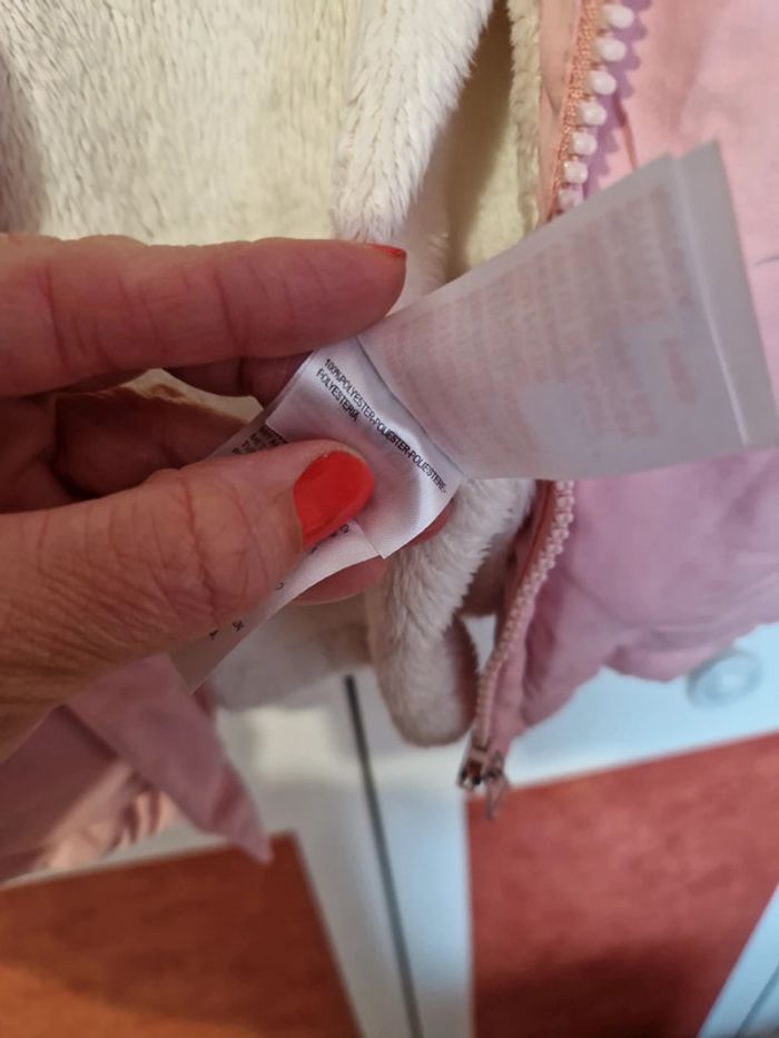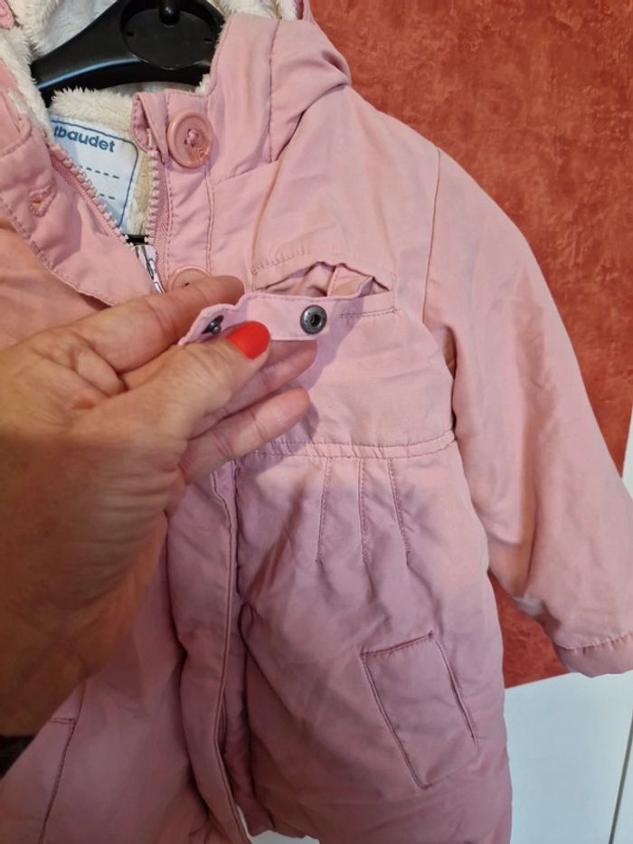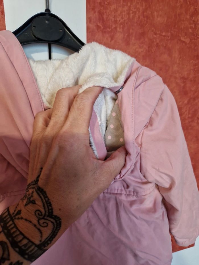 Blouson en très bon état. Très peu portée. Avec capuche. Doublure pilou entièrement détachable pour faire un Blouson 1/2 saison. Dans la poches haute accroche tétine.