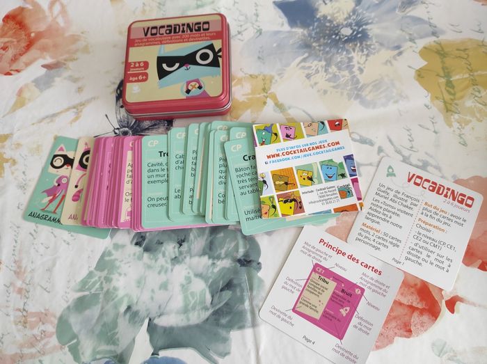 Découvrez le jeu Vocadingo de Cocktail Games, un jeu de cartes éducatif pour enrichir son vocabulaire du CP au CM1 en s’amusant! Quatre extra-terrestres débarquent pour étudier notre langue. Au programme : 200 mots avec pour chacun sa définition, son anagramme (par exemple « rame » et « mare ») et sa devinette! Donnez les bonnes réponses et gagnez un maximum de cartes mots. Excellent état on n'a jamais joué avec