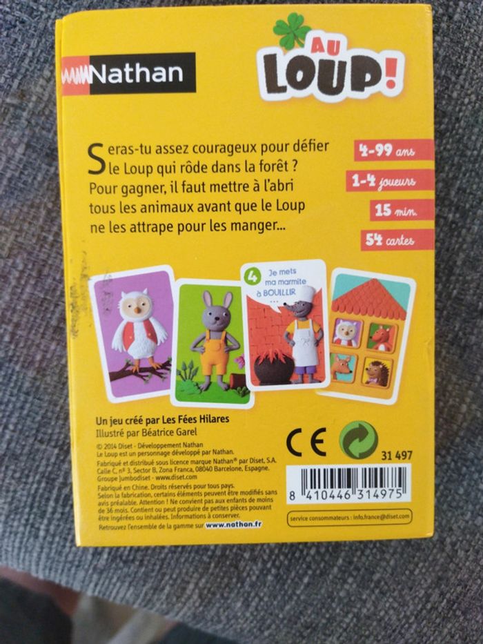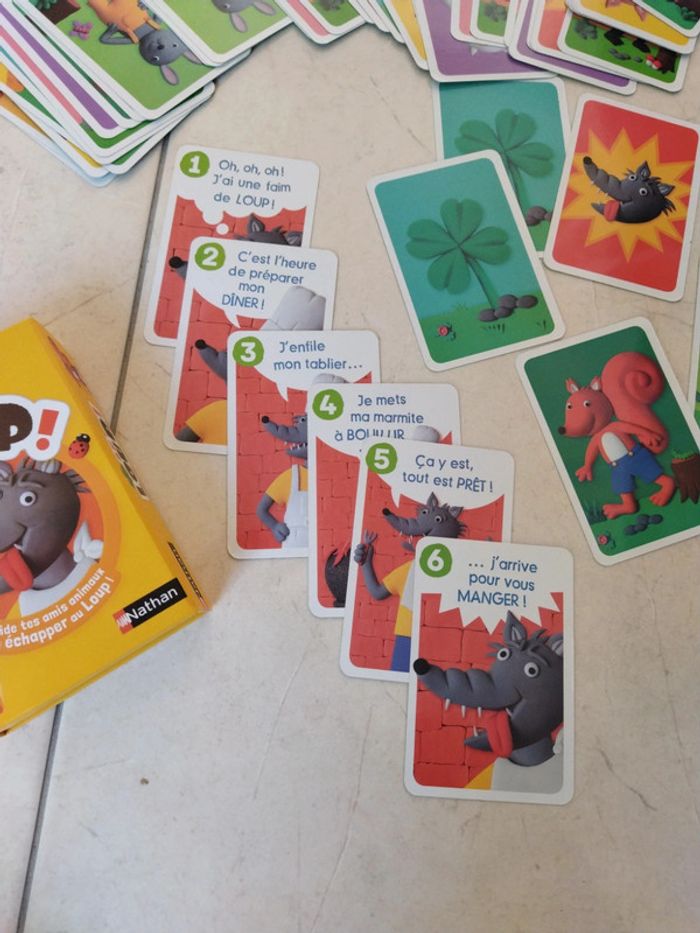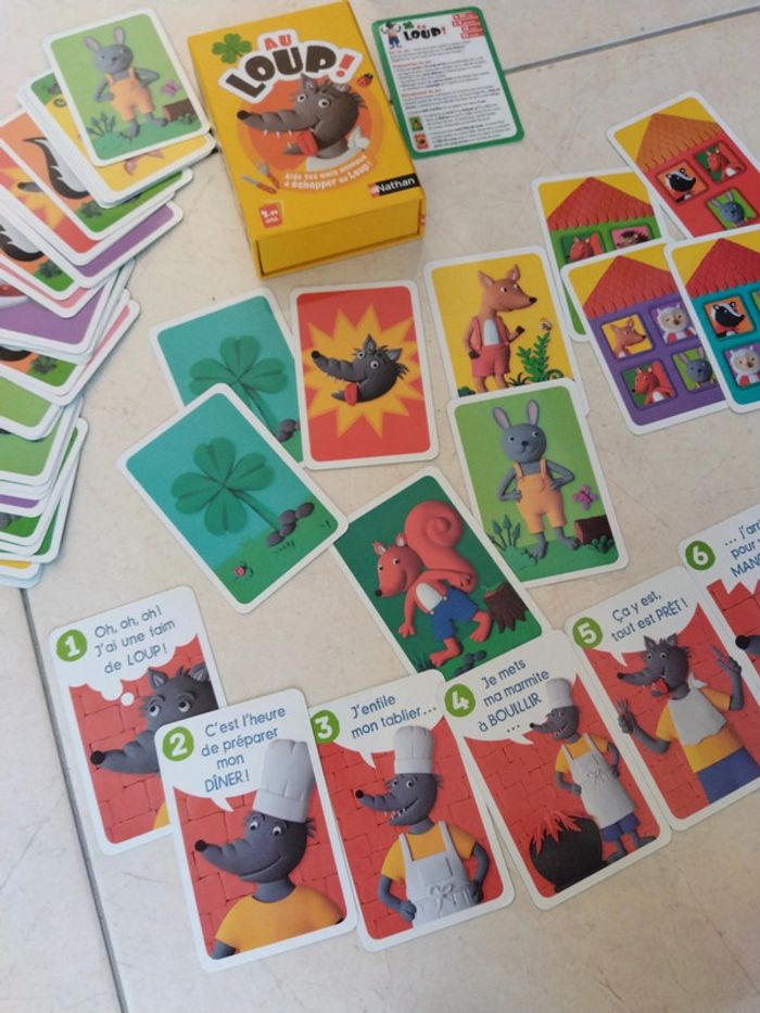 Addictif! Parties rapides, environ 15 minutes. Les enfants adorent les cartes, le jeu fait travailler la mémoire et est très ludique : il faut mettre à l'abri les animaux avant que le loup ne les dévorent!! Toute ses cartes sont en très bon état, jeu complet avec les règles, boîtes bon état (traces au niveau du scotch de fermeture). Vous allez adorer!