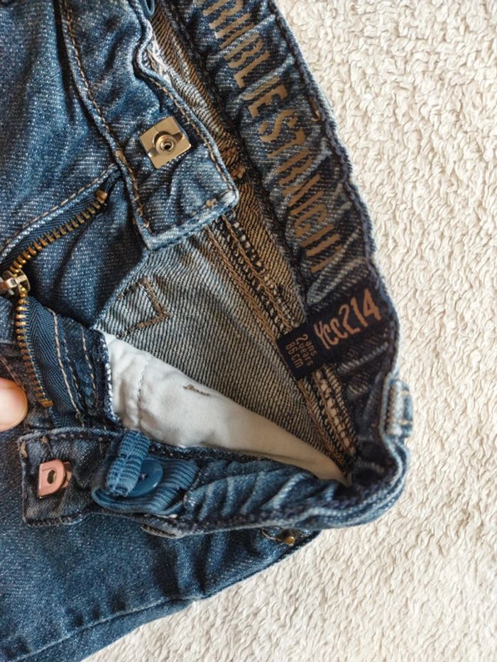 Taille réglable avec bouton et élastiques. 65% coton. Excellent état.
