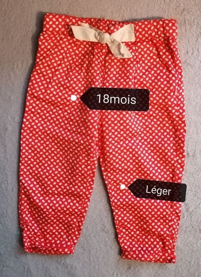 Pantalon bébé filles Marque Obaibi Age :18mois ( 80cm) Taille élastique réglable Petit papillon en satin ( décoration). Couleur :rouge /blanc 2 petites poches sur les côtés. Neuf sans étiquettes 6€