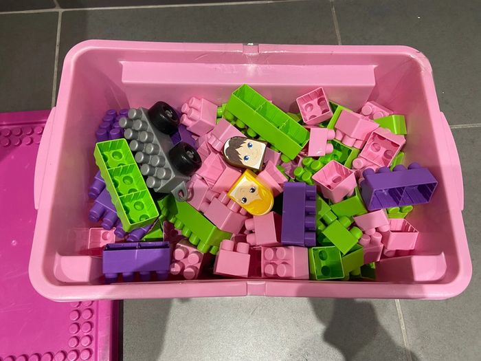 La boîte est un peu abîmée mais se ferme correctement, vendue avec des briques supplémentaires.