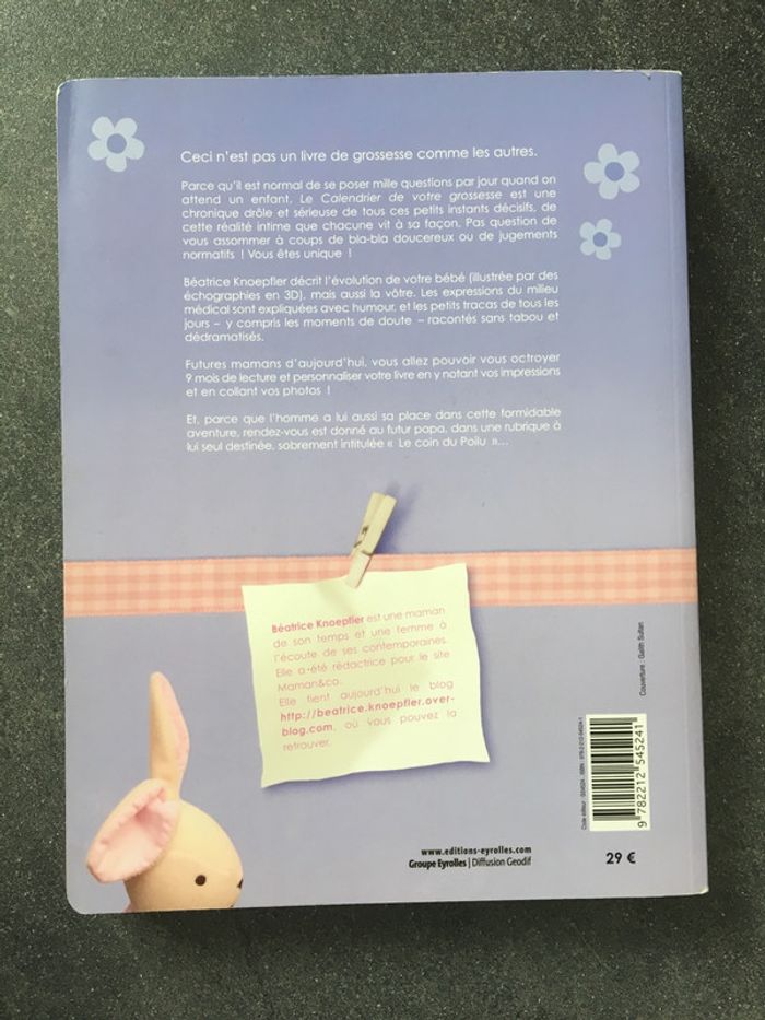 Je vends le livre que j’avais acheté pour suivre tous les jours l’évolution de ma grossesse. Il est très bien fait : évolution du bébé, conseils médicaux et administratifs, examens, rôle du papa... 1 page par jour En très bon état Valeur : 29€