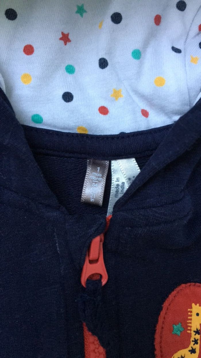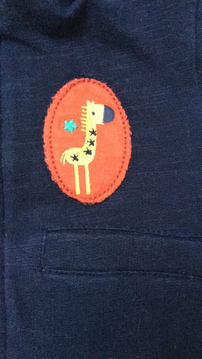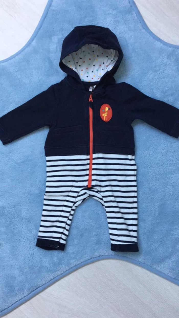 Combinaison bleue marine et blanche Fermeture zipée et pressions entre les jambes Motif petite girafe Très bon état, porte 1 fois