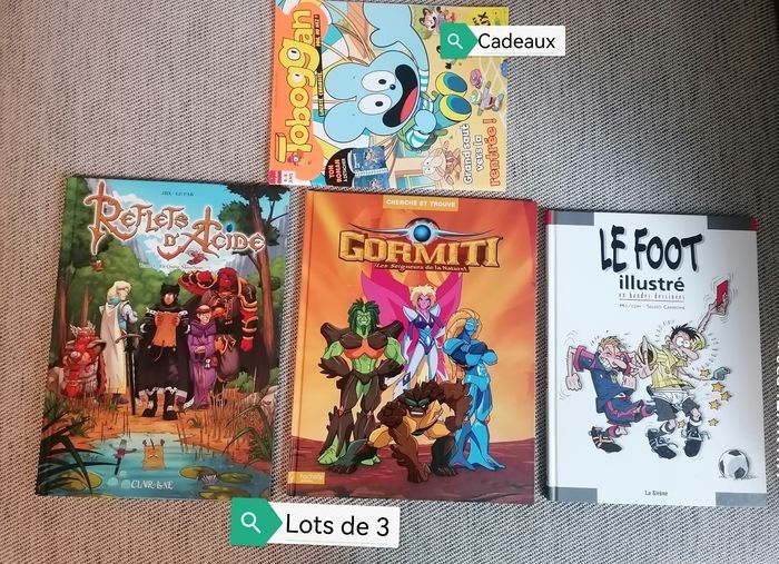Lots de 3 livres. 1) gormiti ( les seigneurs de la nature). 2) Reflets d'acide (tome 1 la quête sans nom. 3) le foot illustré en bandes dessinée. ( toboggan 6/8ans) offert. Le lots. 8€