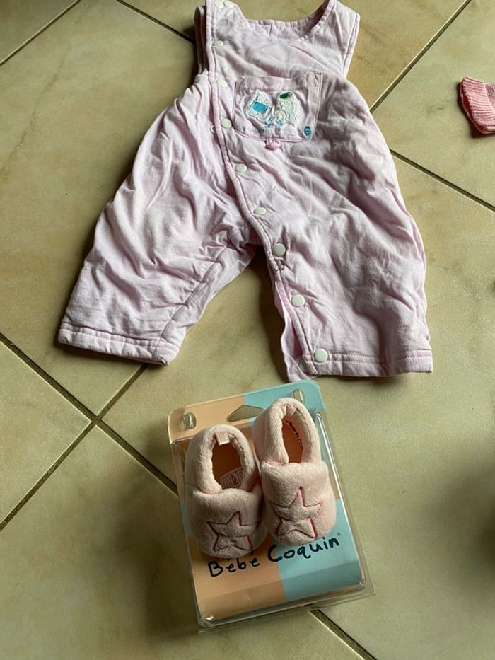 Lot vêtements bébé fille 1 mois pull laine , écharpe et salopette chaude, chaussons - photo numéro 1
