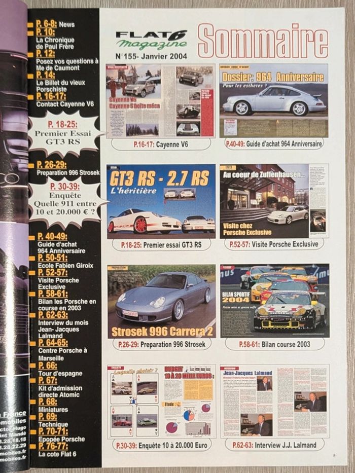#_Porsche_#_Flat6_ numéro 155 (janvier 2004) Cayenne V6, 996 GT3 RS vs 911 Carrera RS 2.7, préparation Strosek 996 Carrera 2, dossier 964 Anniversaire, visite Porsche Exclusive... 116 pages D'autres numéros disponibles dans mon dressing