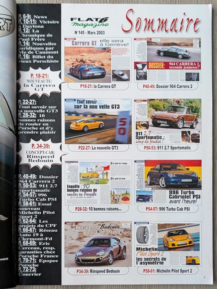 #_Porsche_#_Flat6_ numéro 145 (mars 2003) Carrera GT, la nouvelle GT3, 10 bonnes raisons de rouler en Porsche, concept car Rinspeed Bedouin, 964 Carrera 2, 911 2.7 Sportomatic, 996 Turbo Cabriolet PSI, boites 915... 124 pages D'autres numéros disponibles dans mon dressing