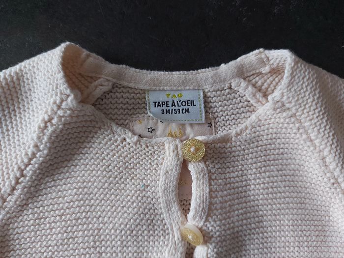 Bonjour, Je vends ce gilet court en très bon état. Marque: Tape à l'œil Taille: 3 mois (59 cm) Coloris: beige Composition: voir photo #vêtementsfilletroismoismalau_titia