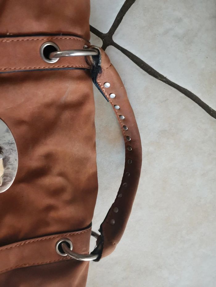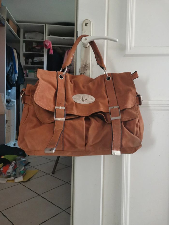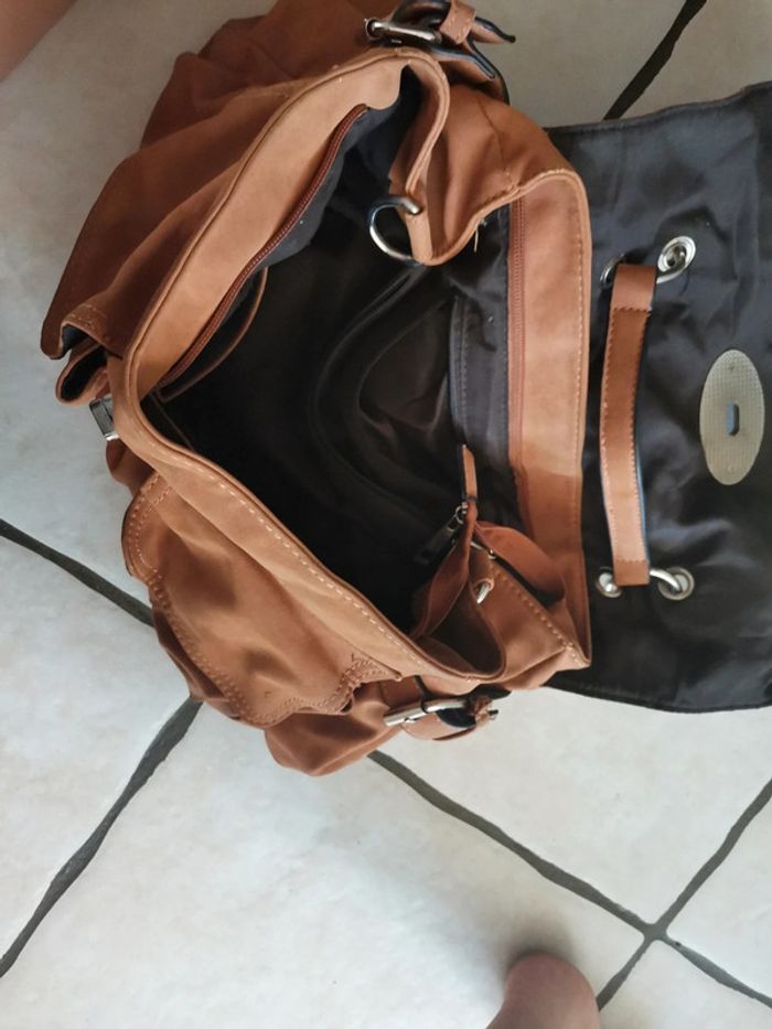 Sa effet daim avec 2 poches sur le devant. Possibilité de fermer l'intérieur avec une fermeture éclair. Poignée un peu abîmé
