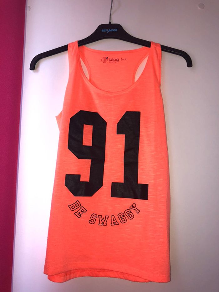 débardeur orange fluo avec écriture taille 14ans #débardeur #débardeurfille #vetementsfille #vêtementsfilles #debardeur14ans #jjoannaaafille
