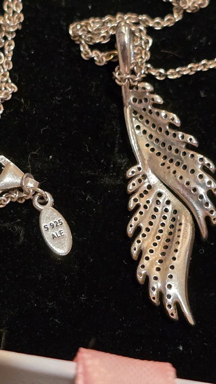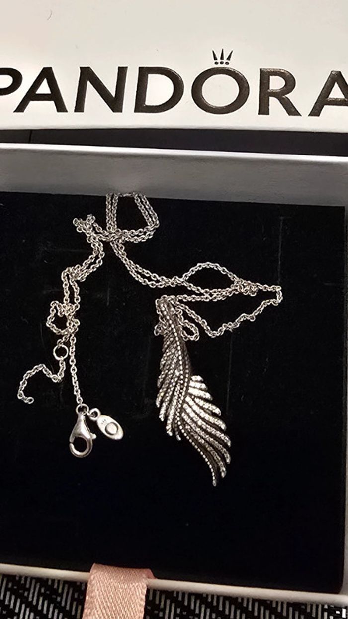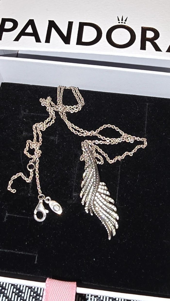 Vends collier pandora avec grand pendentif aile d'ange brillante. Très bon état
