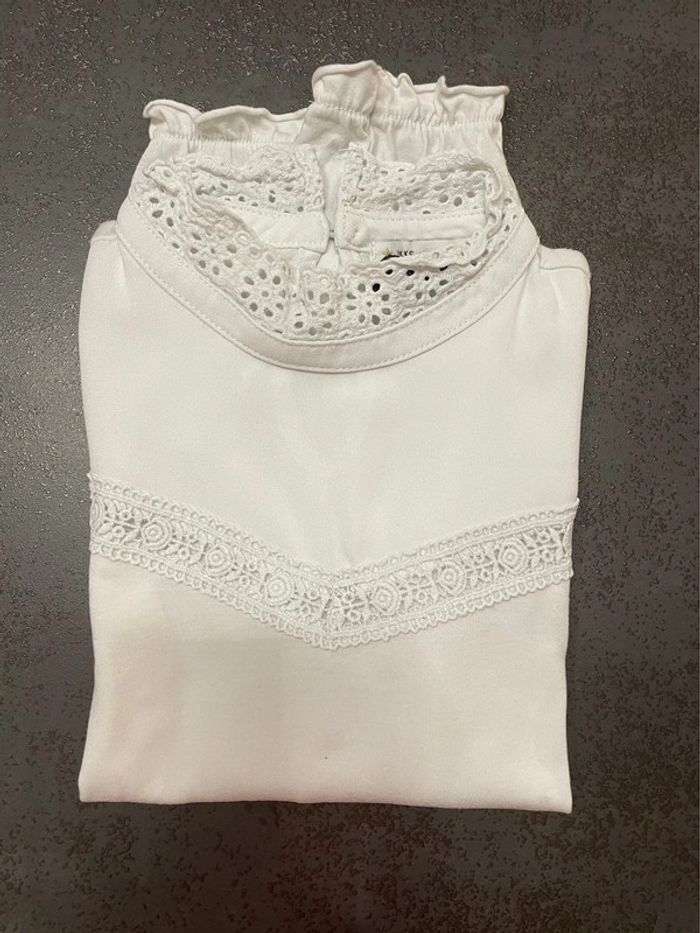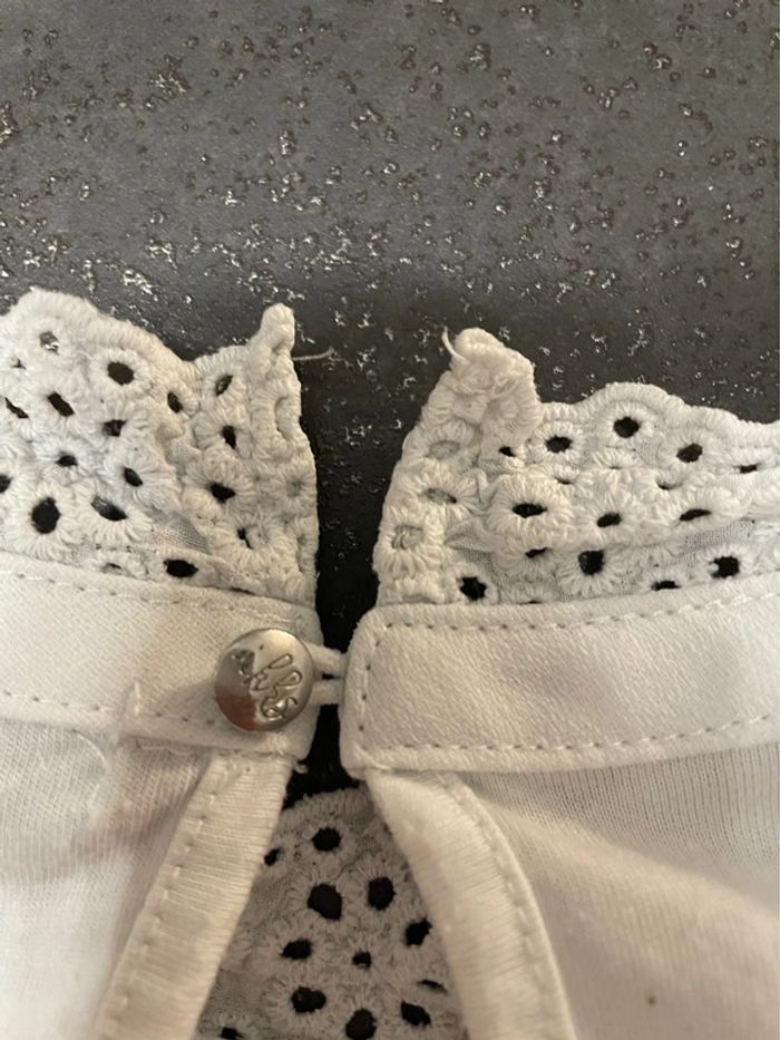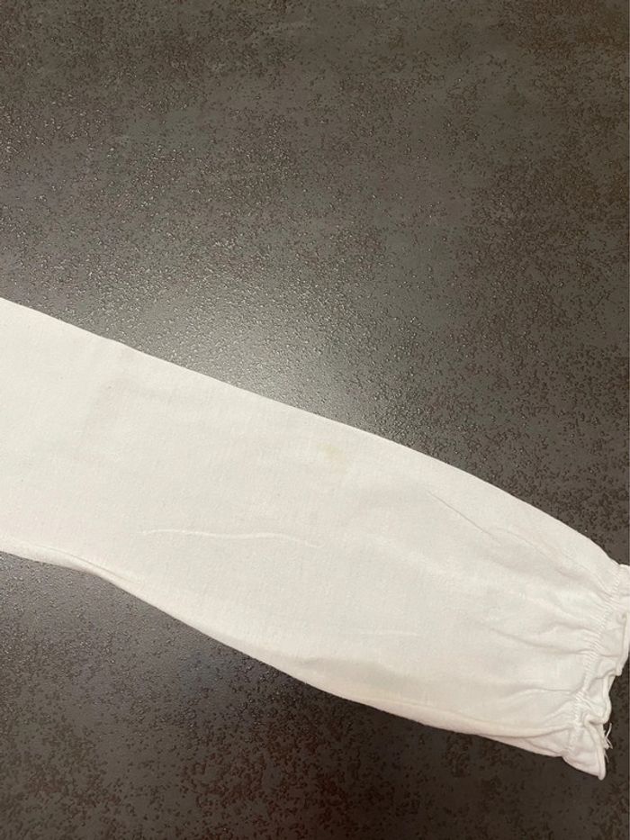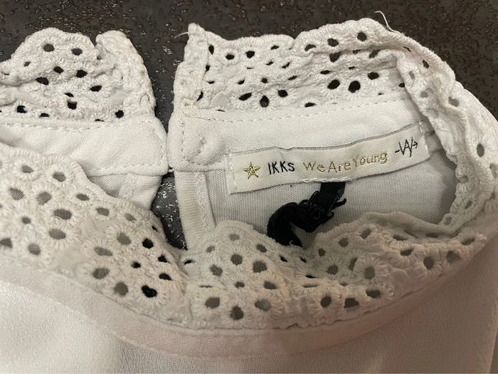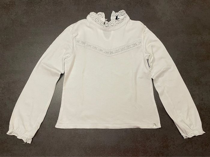 T shirt fille blanc à manches longues IKKS. Pas d’étiquette. C’est bien du 10 ans. Il y a une petite tache sur la manche arrière droite, elle est très peu visible mais n’est pas partie au lavage (voir 2 dernières photos). Taille bien #dressingsolene1714fille10ans