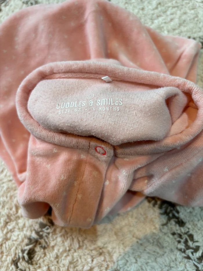 Grenouillère / pyjama en velour CUDDLES & SMILES (JBC) rose avec des petits triangles blancs sans pieds. Taille 62 cm / 3 mois. #celin_ee_ja_3m_62cm