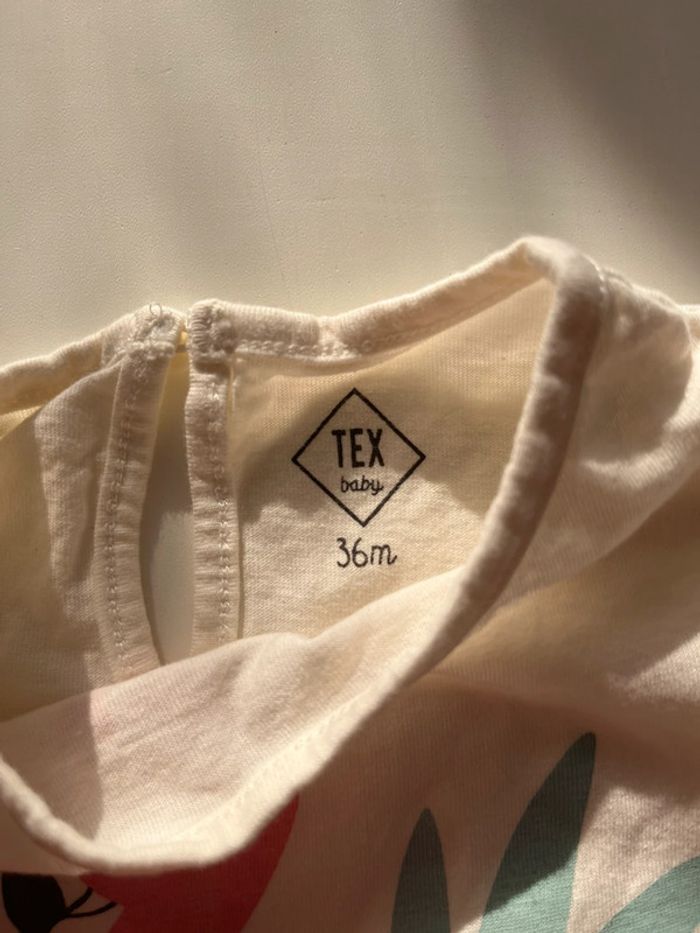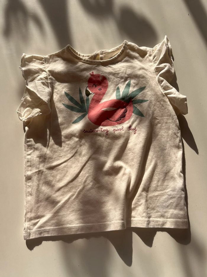 T-shirt beige « swimming pool day » avec une bouée flamant rose. Jamais porté. Marque: tex Taille: 36 mois