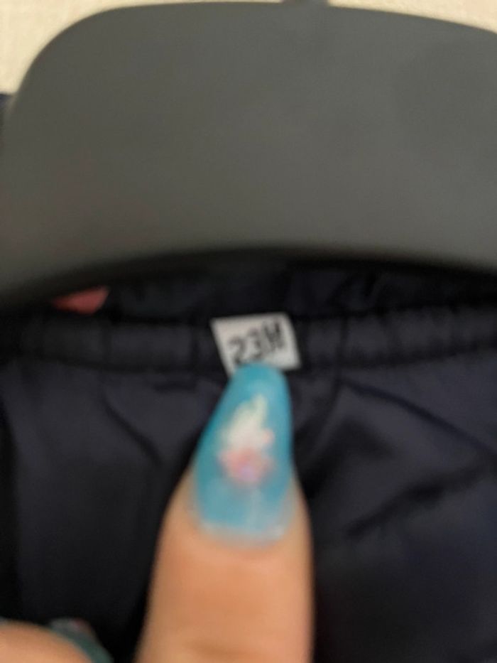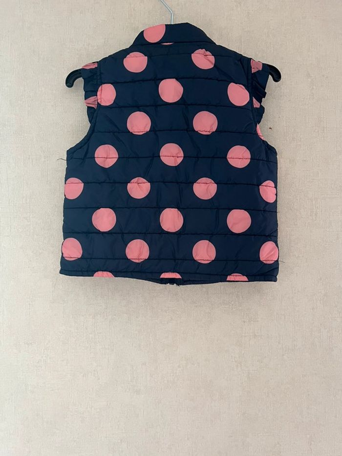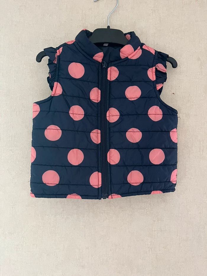 Doudoune sans manche bleu marine à pois rose, en très bon état. Taille: 23 mois