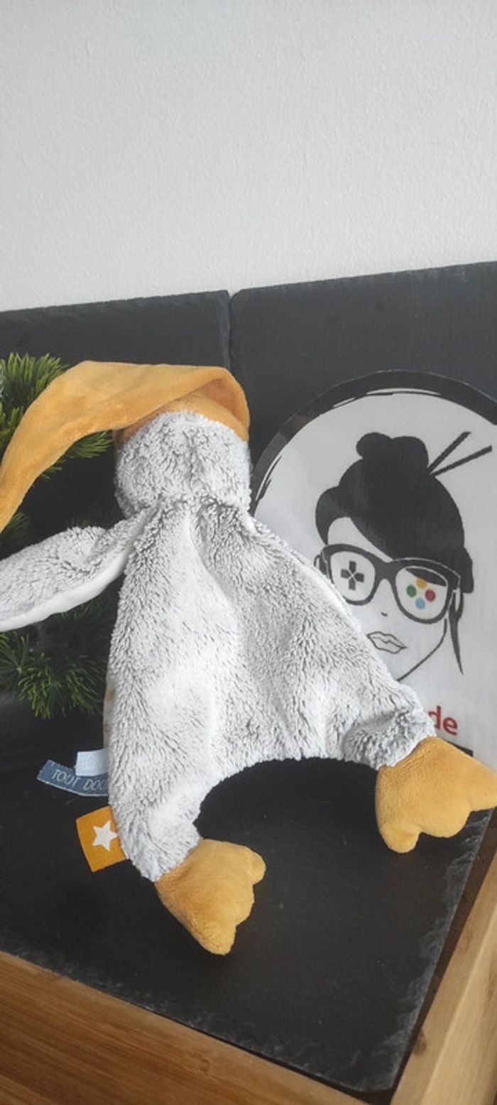 Doudou plat Pingouin blanc gris moutarde jaune tape à l'oeil tao zig zag bonnet nuit - photo numéro 1
