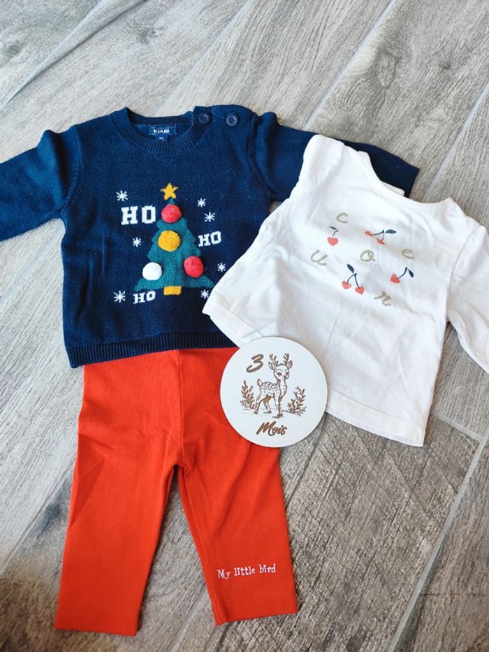 Pull de Noël Kiabi (cf photo, t-shirt tape à l'oeil avec paillettes et legging orchestra. Je fais du tri dans les placards, n'hésitez pas à faire des lots je dois faire de la place. Pour retrouver tous les articles de la même taille/marque/thème, cliquez sur mon lien: #fille3mois_ladouks