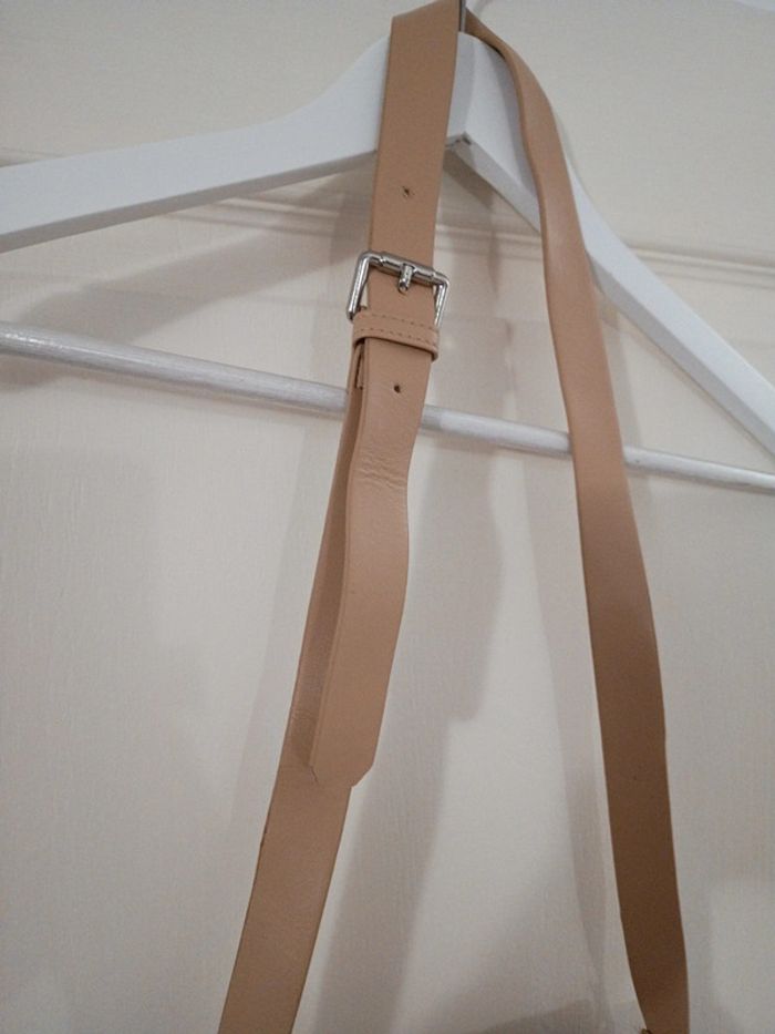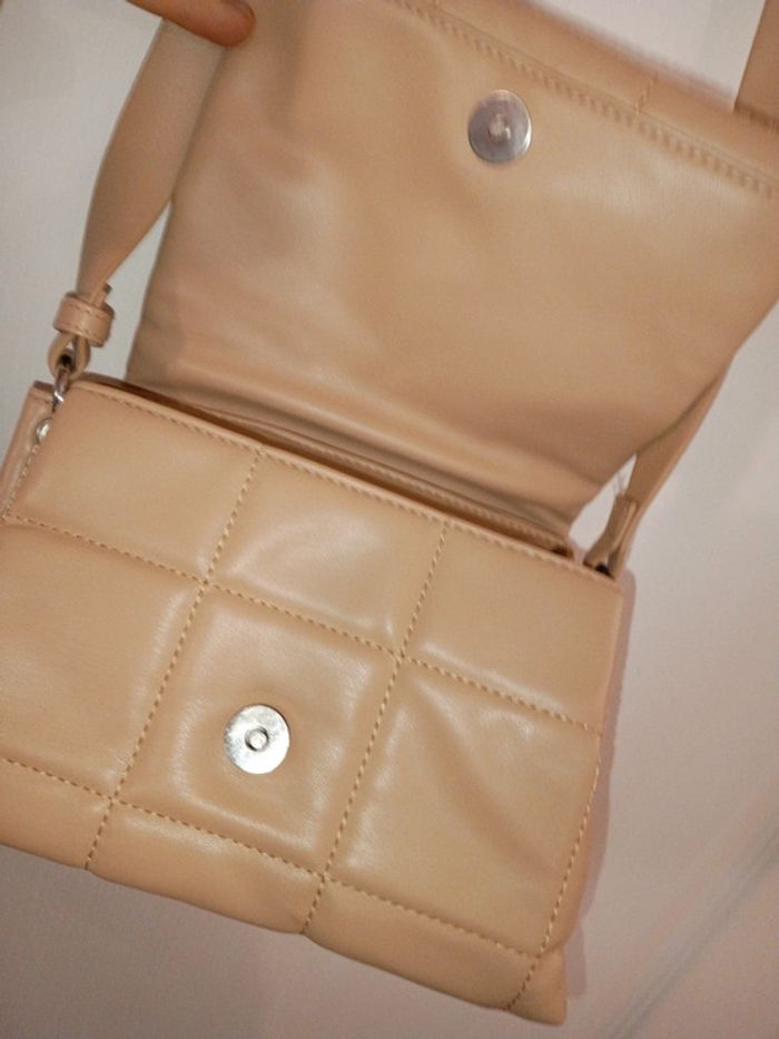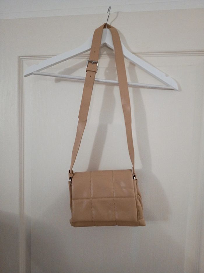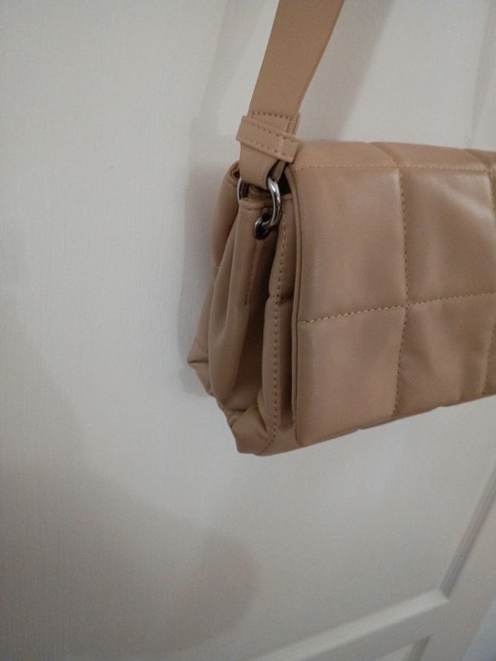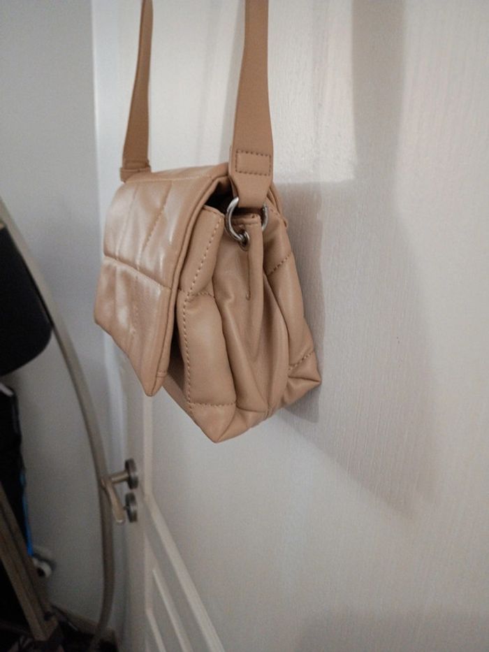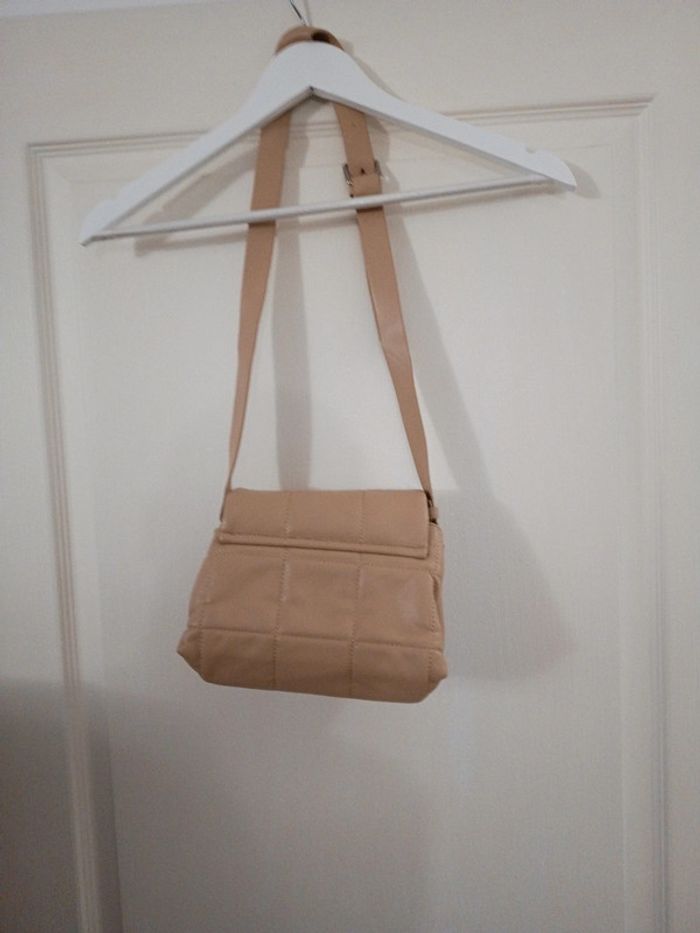 Petit sac à main coloris beige avec bandoulière hauteur 18,5 cm largeur 10 cm environ. En excellent état.