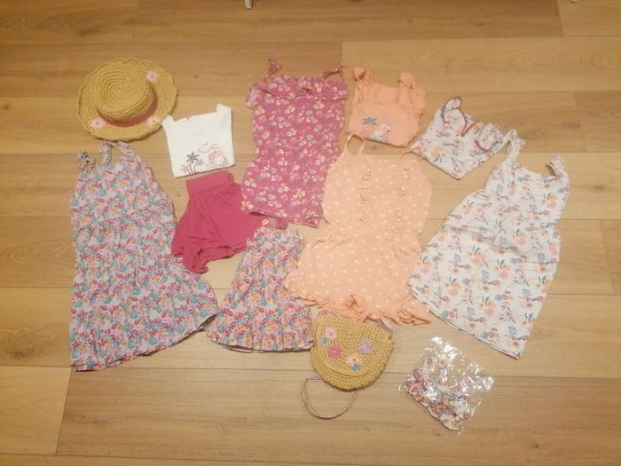 Magnifique lot de 11 pièces thème l'enfant des vagues été 2022 composé de: - chapeaux avec ruban et broderie fleurs - combishort imprimé fleur corail fluo - débardeur corail à motif chat fantaisie - débardeur écru à imprimer fleuri et flamant rose - jupe à volant en popeline à imprimé Fleuri - robe bain de soleil en popeline à imprimé Fleuri - robe écru à imprimé fleuri et flamant rose - sac bandoulière - salopette courte fushia t-shirt détail nude imprimé dos nu - accessoires cheveux très bon état général sauf mention contraire dans l'annonce. #delabarremelaniefille5ans
