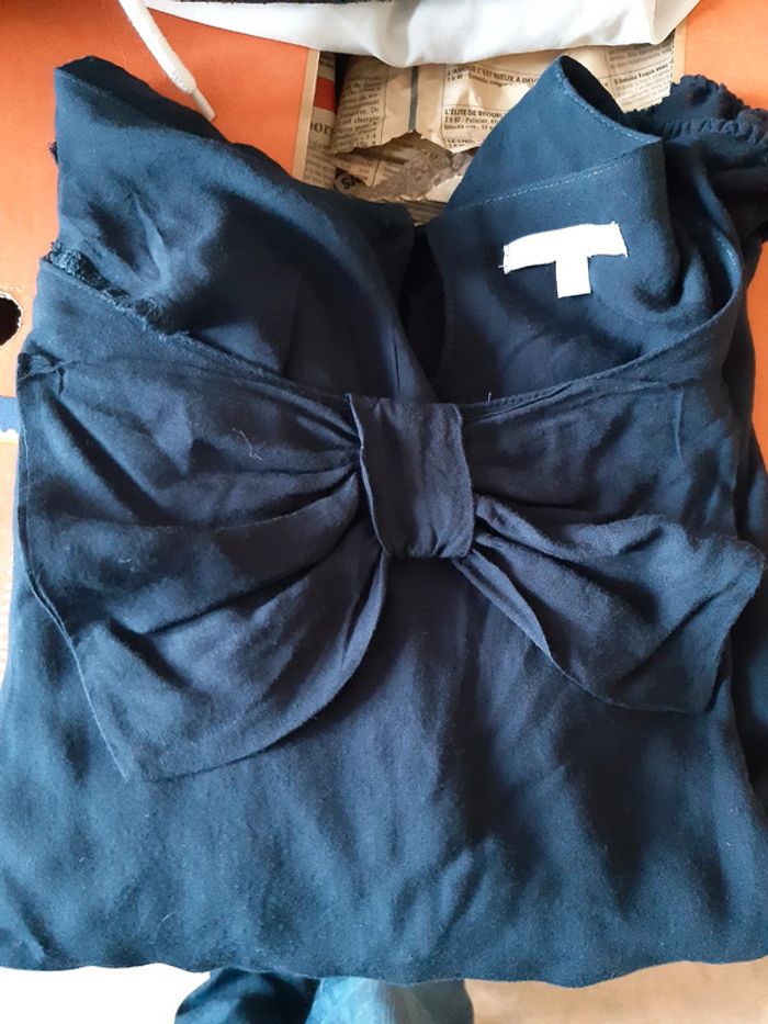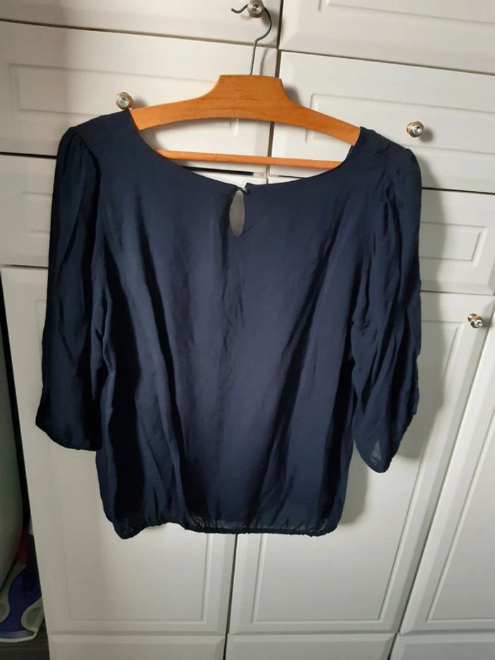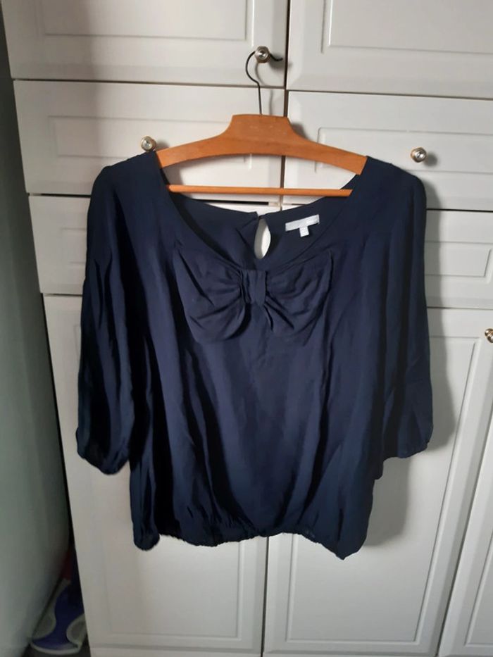 Haut femme Etam Bleu marine Avec un nœud devant Taille 40 Longueur 55 cm Tailke 52 cm Demi manches